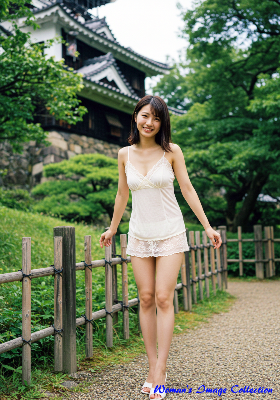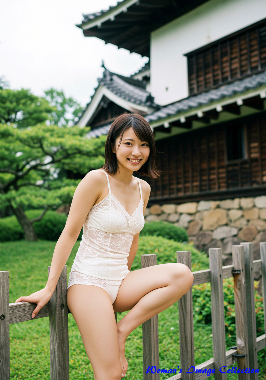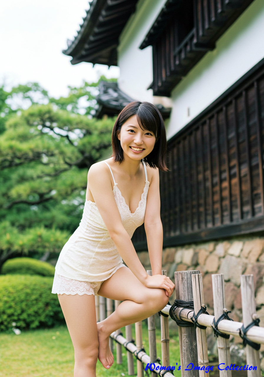 夏の日。涼しそうなフイットした白のミニシミーズの笑顔がかわいい若い日本人女性。日本の古城の庭。ローアングルの写真。ランダムな髪形。ランダムな表情。板塀。