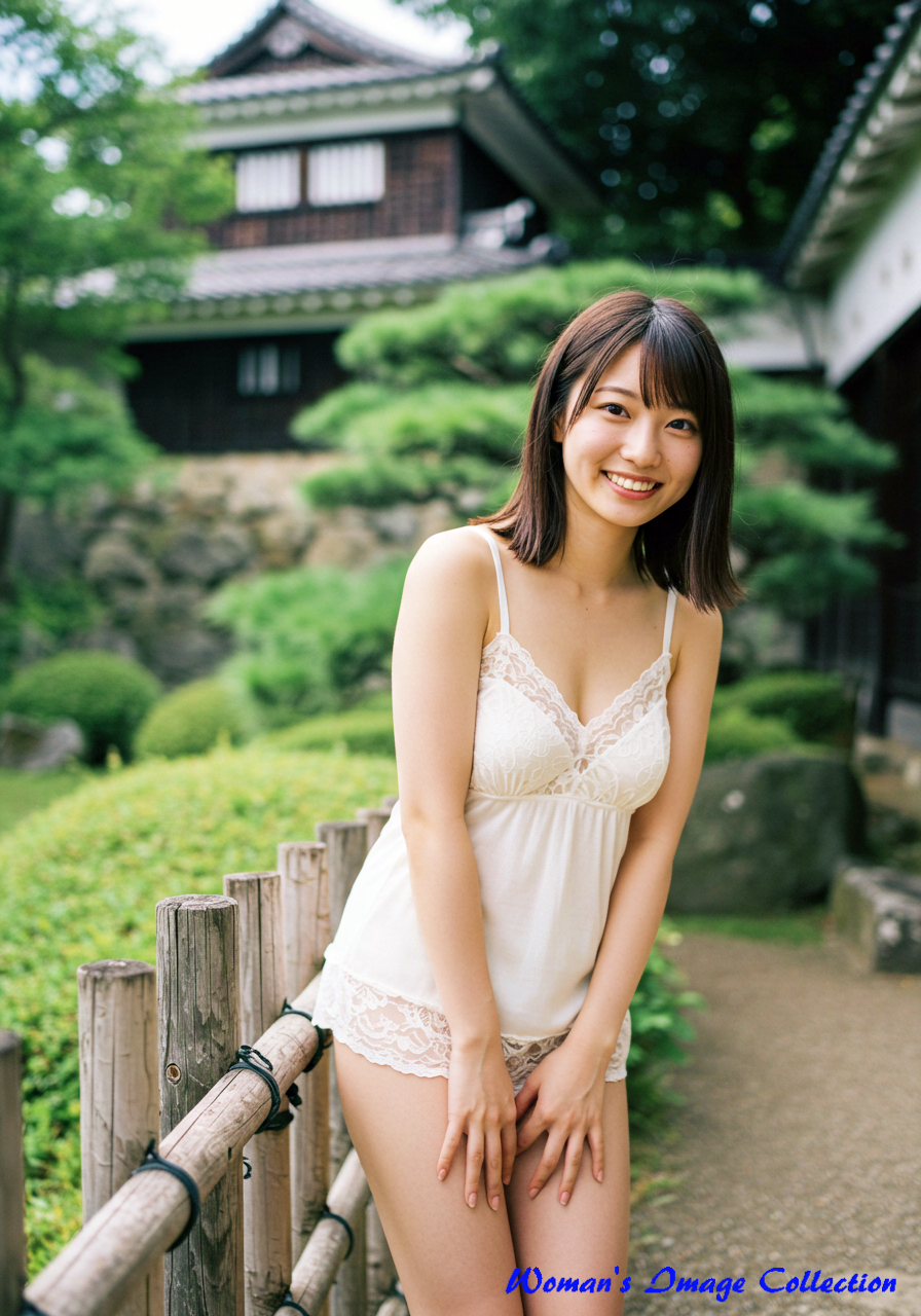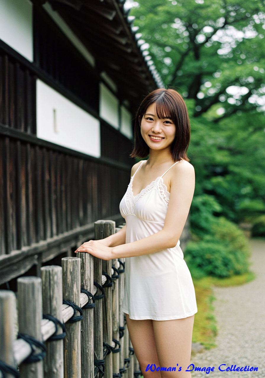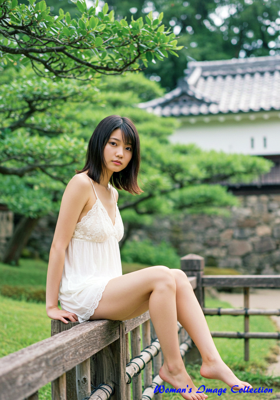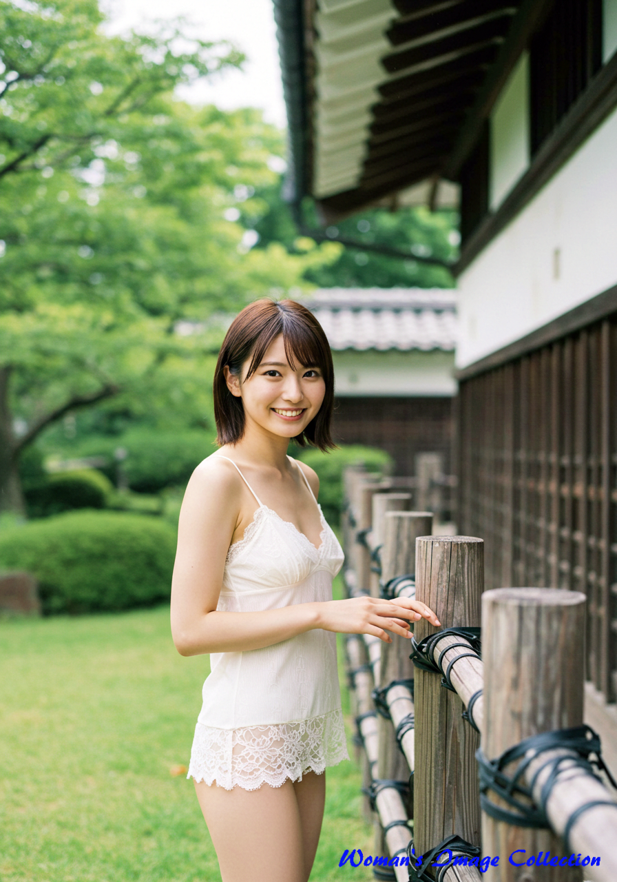 彼女の髪は、艶やかな黒髪で、顎のラインで切り揃えられたボブスタイルが、彼女の顔立ちをすっきりと見せている。その髪が、夏の光を浴びて温かく輝くたび、私は遠い夏の日の、穏やかな風の記憶を思い出す。彼女が纏う白いシミーズは、繊細なレースの模様が施されており、まるで天使の羽衣のようだ。その清潔感が、この写真の持つ清らかな雰囲気を一層引き立てている。
