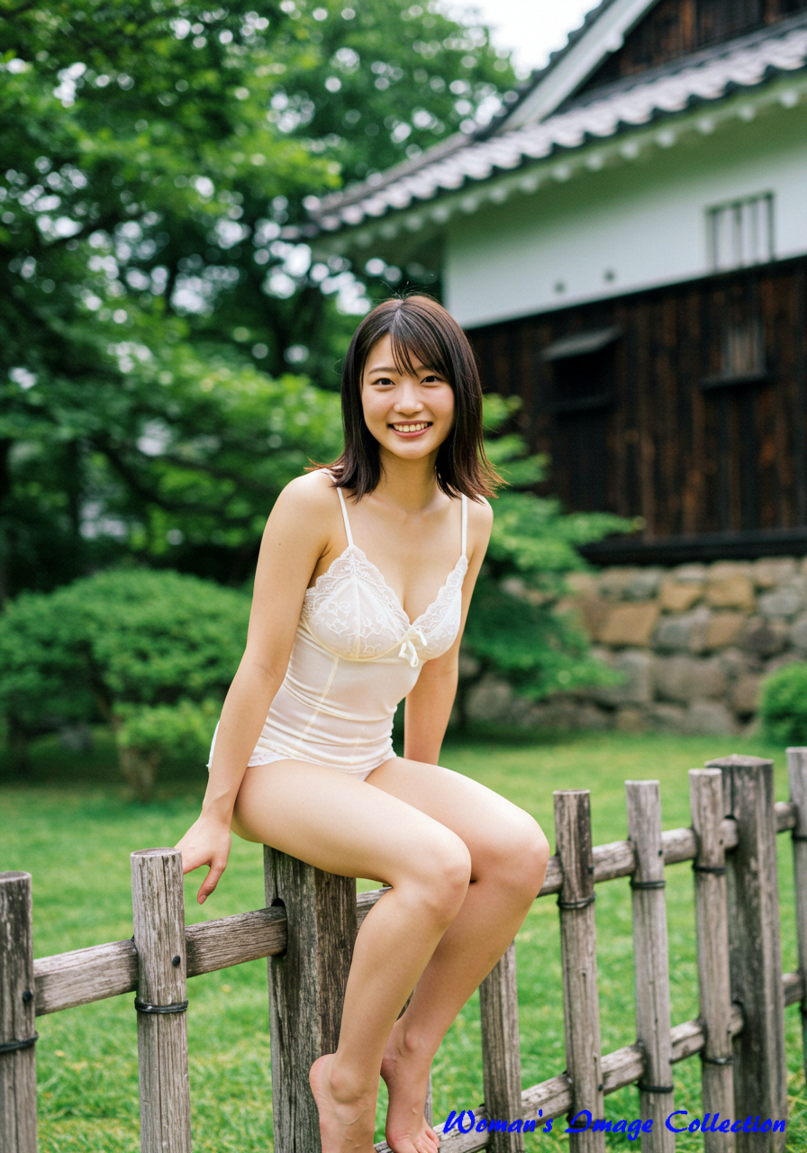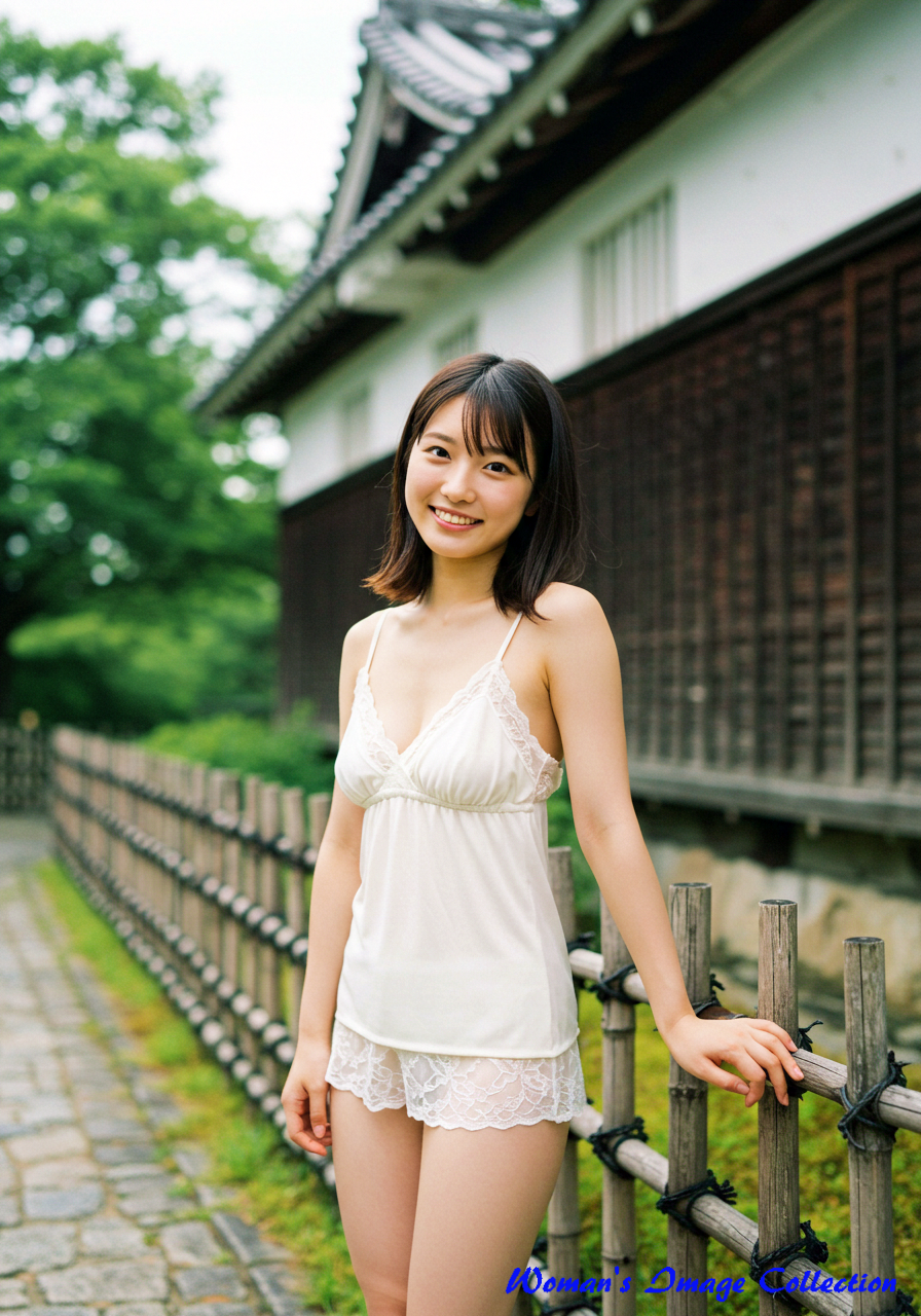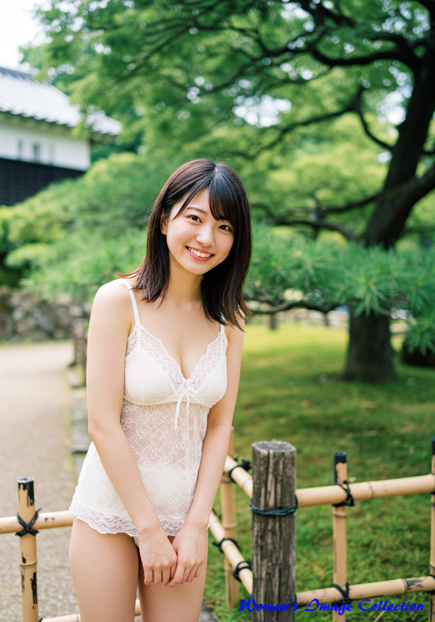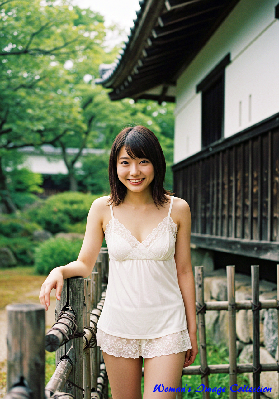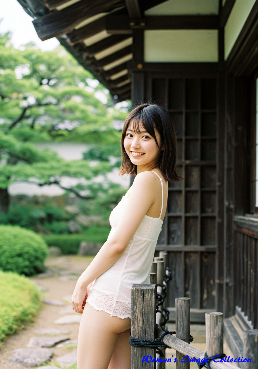 彼女の髪は、艶やかな黒髪で、顎のラインで切り揃えられたボブスタイルが、彼女の顔立ちをすっきりと見せている。その髪が、夏の光を浴びて温かく輝くたび、私は遠い夏の日の、穏やかな風の記憶を思い出す。彼女が纏う白いシミーズは、繊細なレースの模様が施されており、まるで天使の羽衣のようだ。その清潔感が、この写真の持つ清らかな雰囲気を一層引き立てている。