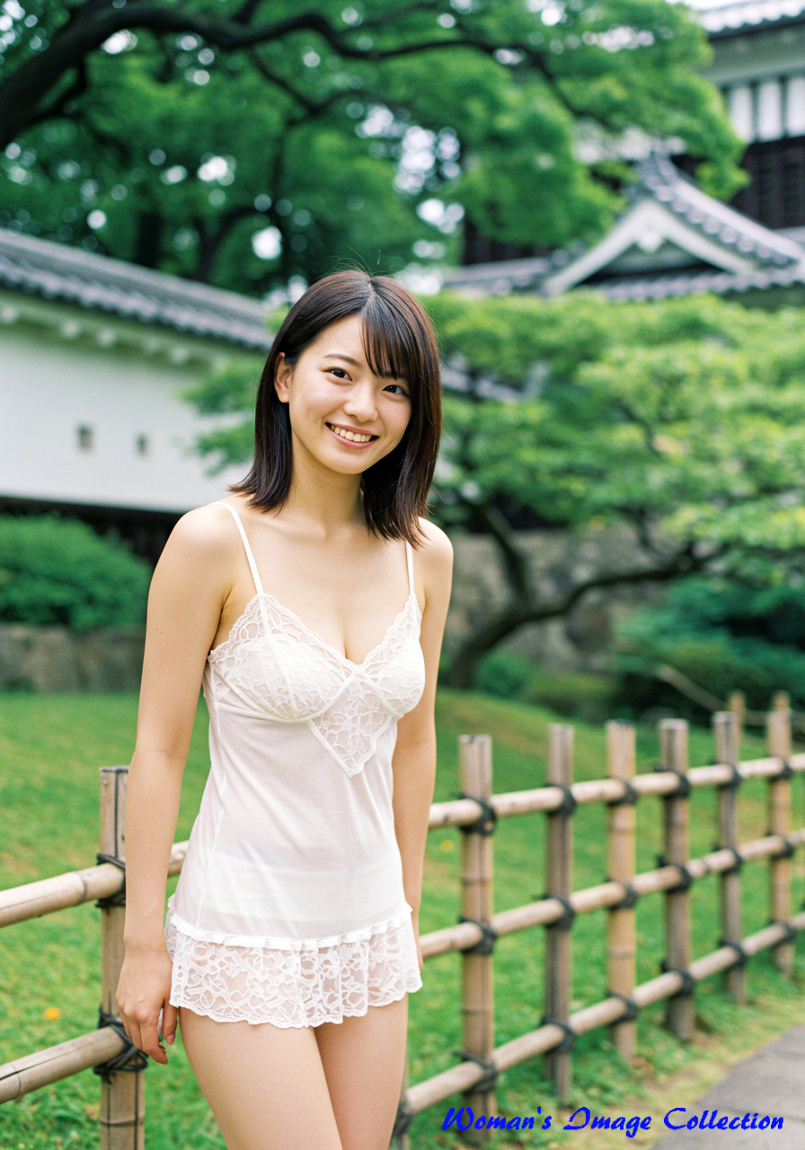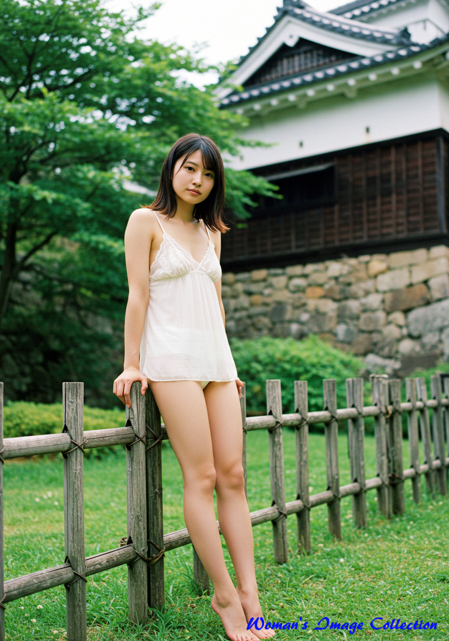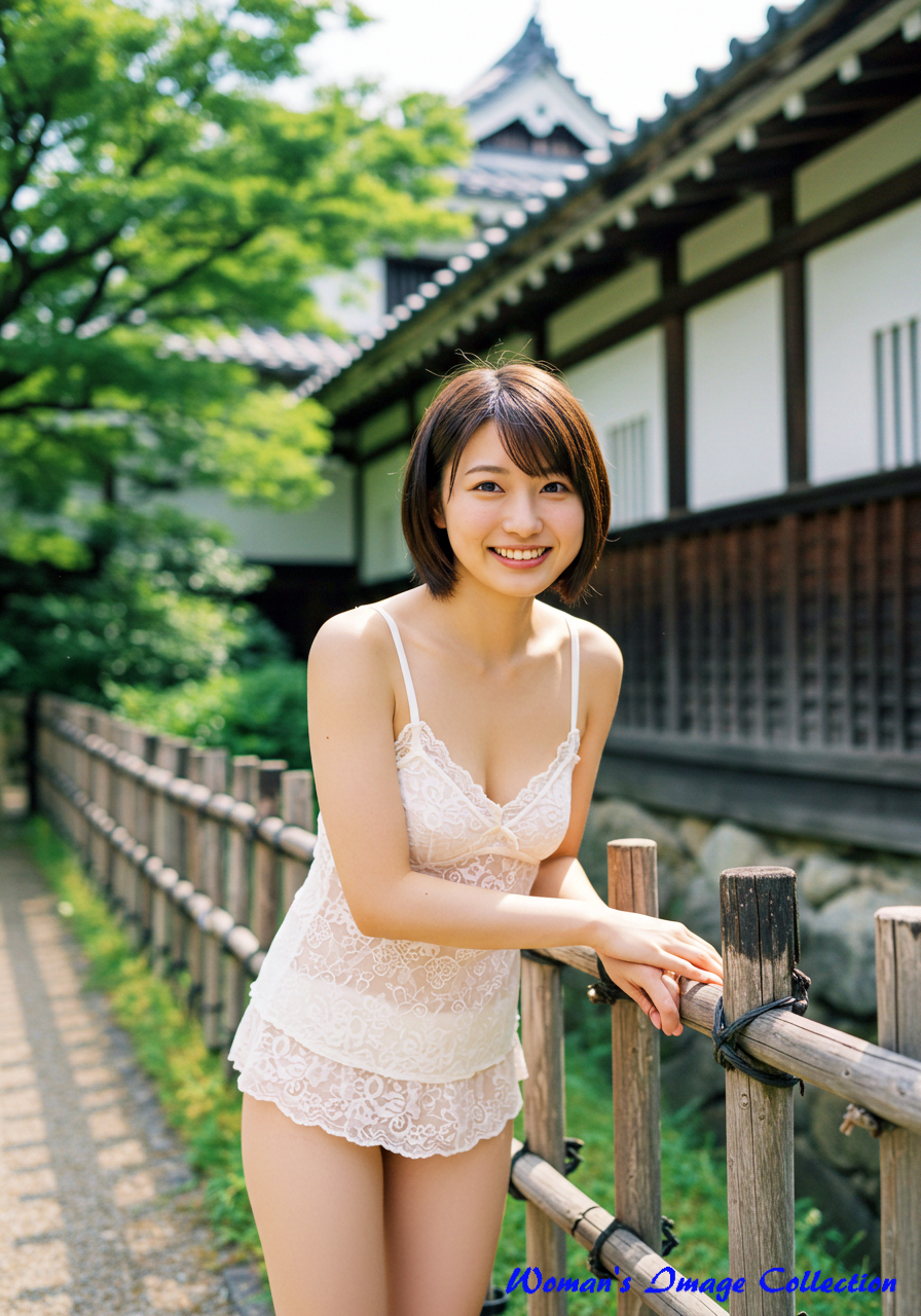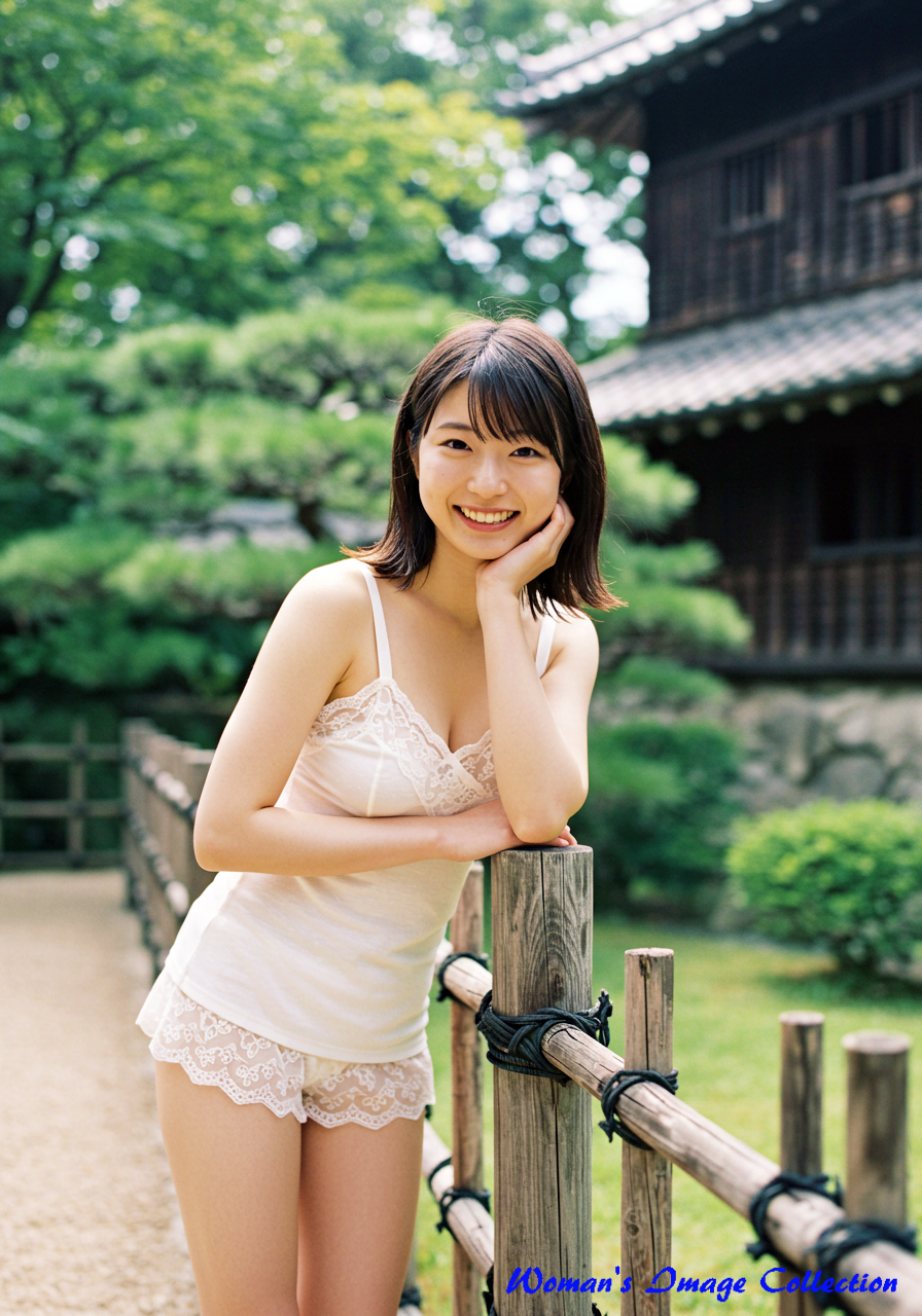 彼女の髪は、艶やかな黒髪で、顎のラインで切り揃えられたボブスタイルが、彼女の顔立ちをすっきりと見せている。その髪が、夏の光を浴びて温かく輝くたび、私は遠い夏の日の、穏やかな風の記憶を思い出す。彼女が纏う白いシミーズは、繊細なレースの模様が施されており、まるで天使の羽衣のようだ。その清潔感が、この写真の持つ清らかな雰囲気を一層引き立てている。