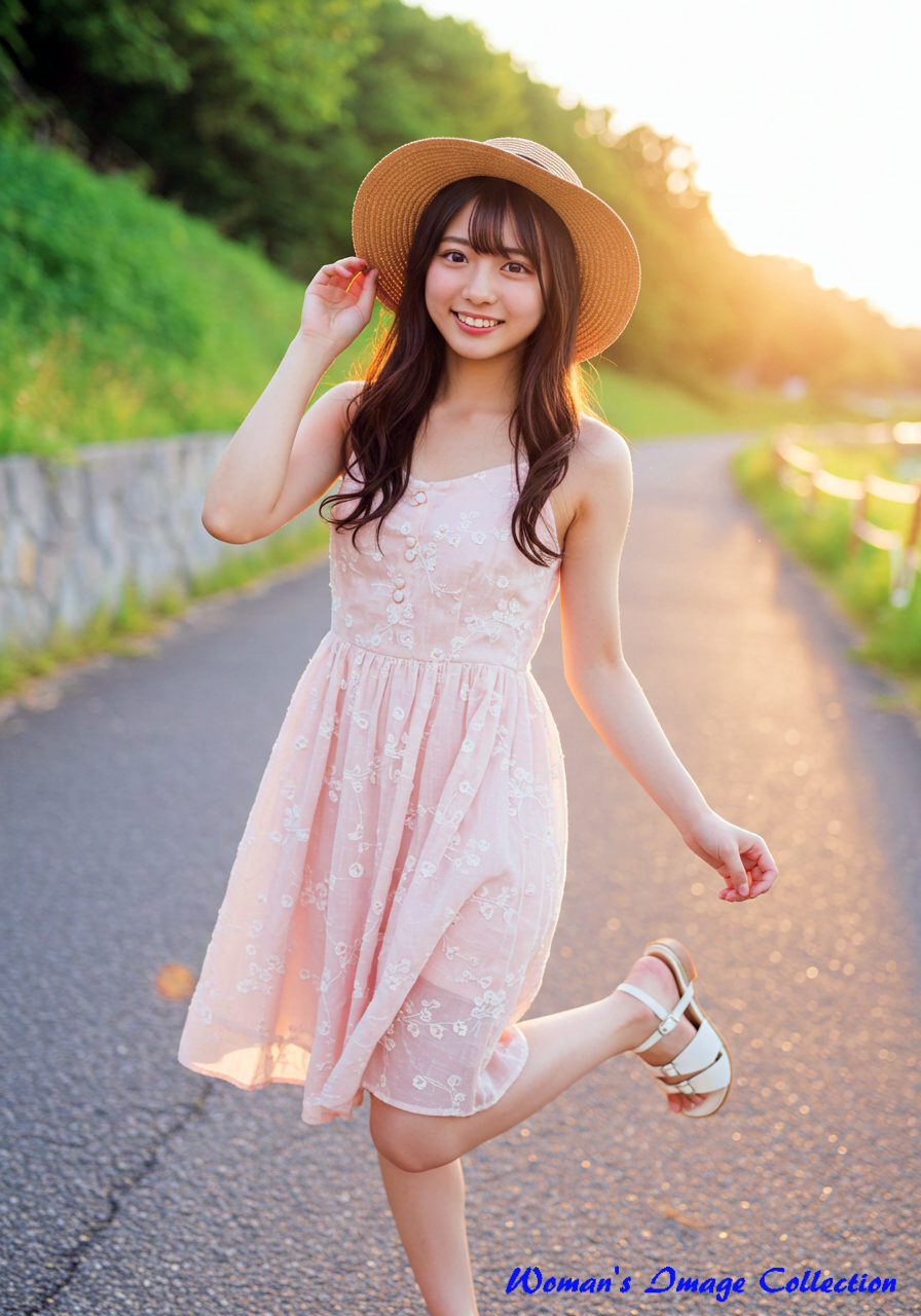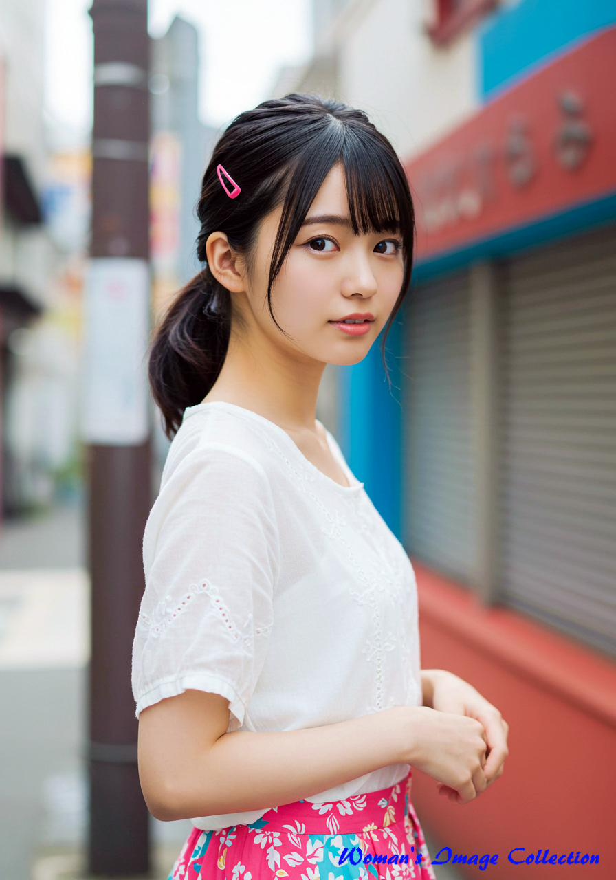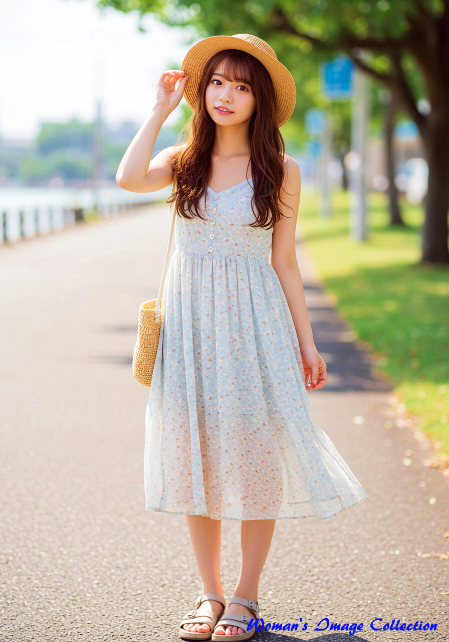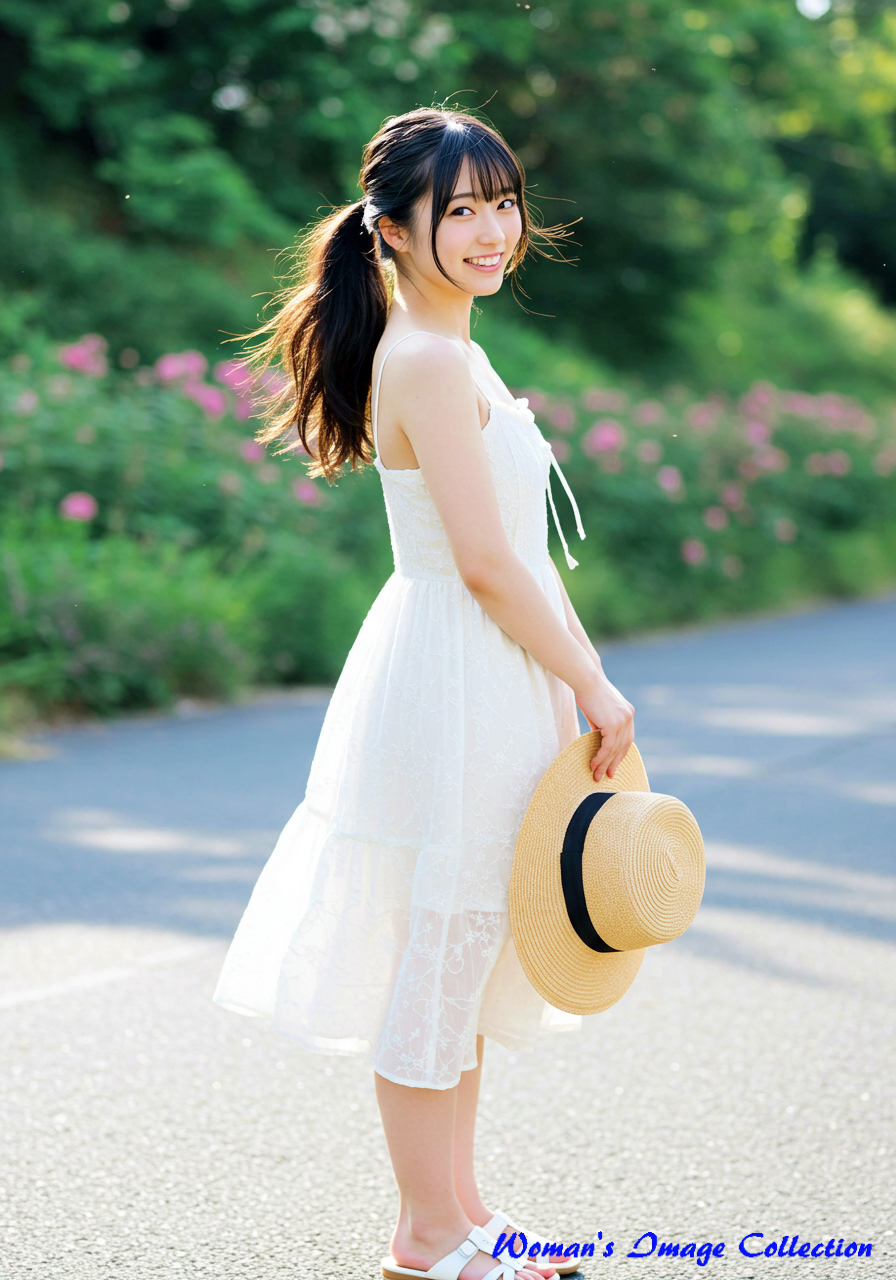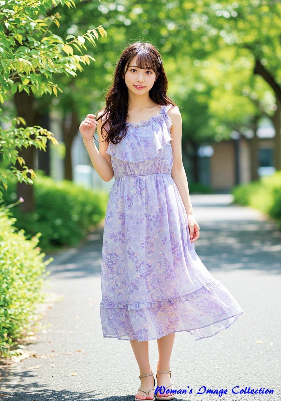 彼女の髪は、艶やかなブラウンで、風になびくように軽やかなウェーブがかかっている。その髪が、夏の光を浴びて温かく輝くたび、私は遠い夏の日の、穏やかな風の記憶を思い出す。彼女が纏う花柄のミニドレスは、風に優しく舞い、まるで彼女自身が、夏の庭園に咲く、一輪の白い花のようだ。その清潔感が、この写真の持つ清らかな雰囲気を一層引き立てている。