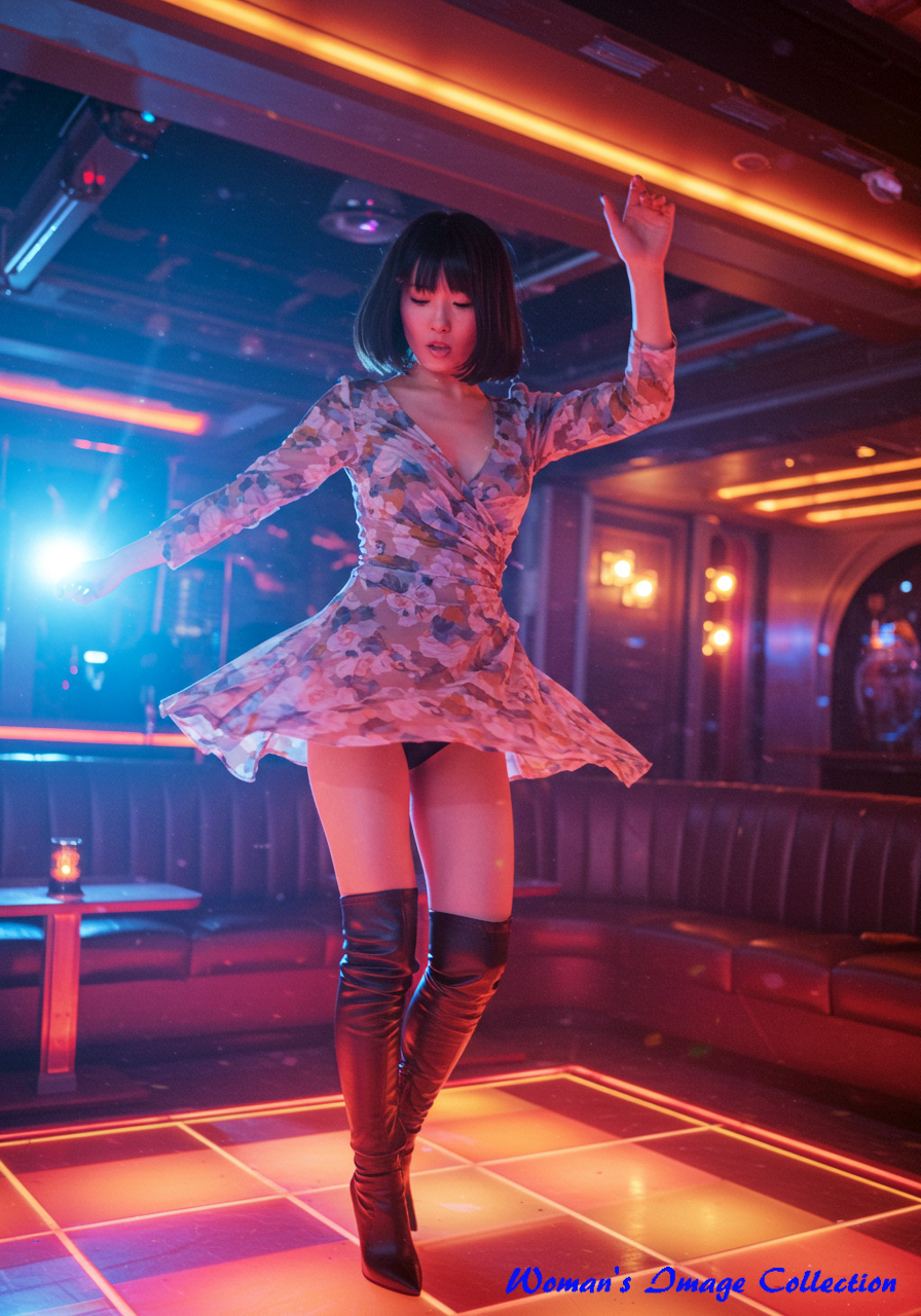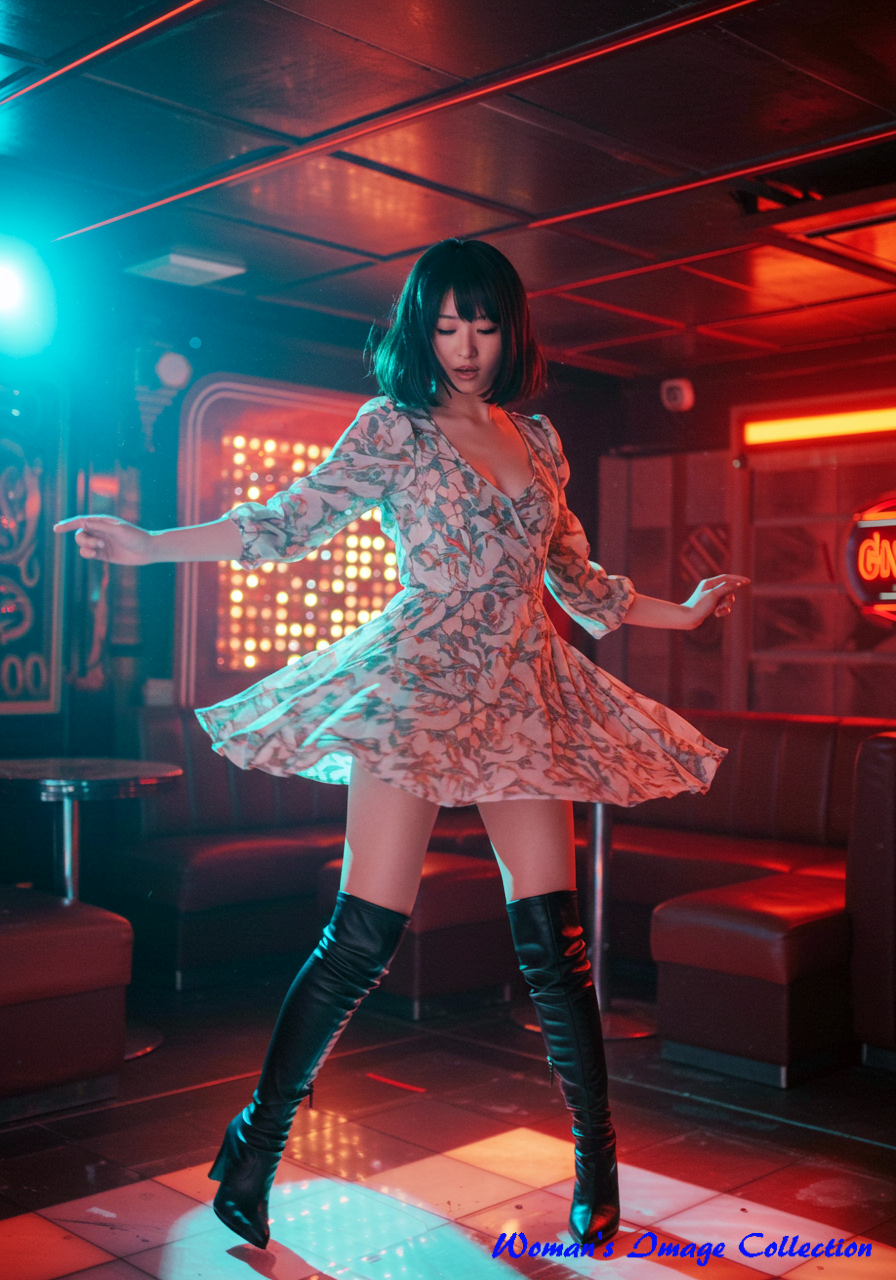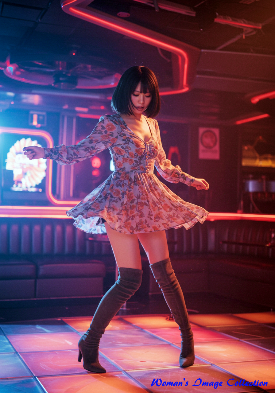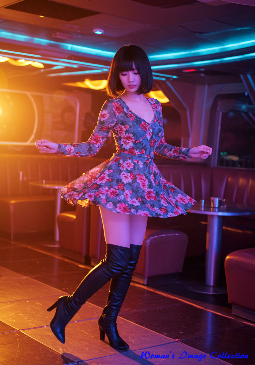 シアーミニドレス の日本の少女が、高転しながら熱心に踊っている。彼女はロングブーツを履き、スタイリッシュなボブカットの髪型をしている。背景:レトロフューチャーな装飾と輝くダンスフロアを備えた未来的なラウンジ。