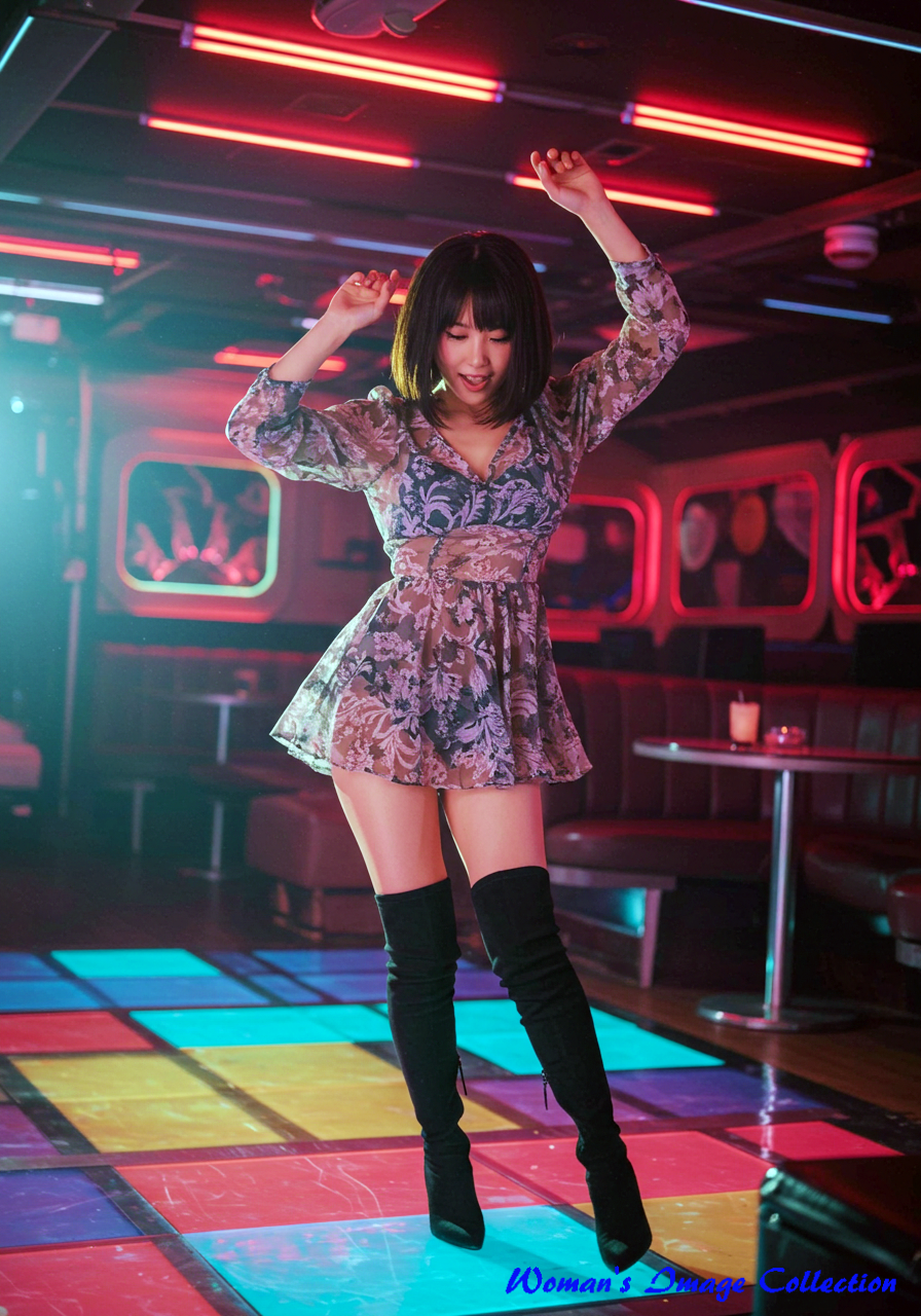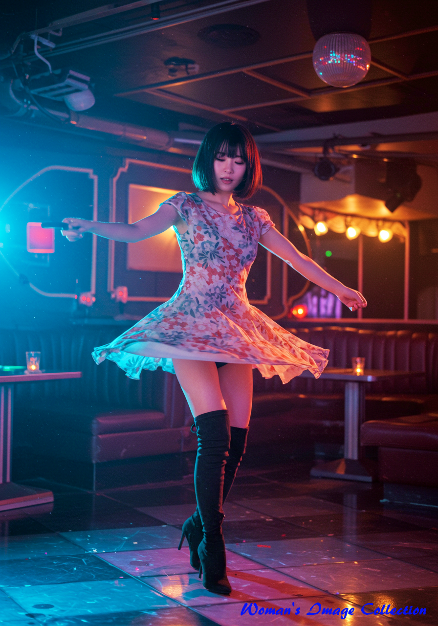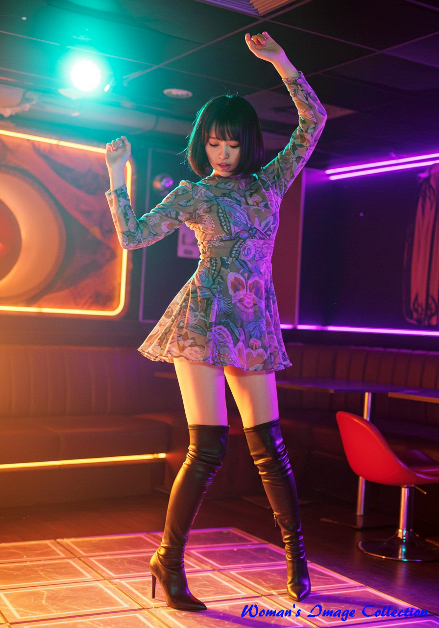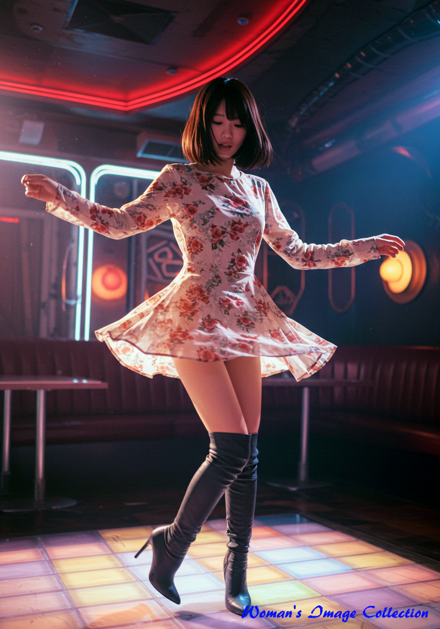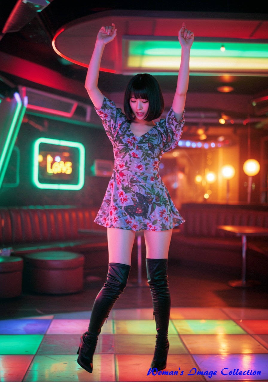 シアーミニドレス の日本の少女が、高転しながら熱心に踊っている。彼女はロングブーツを履き、スタイリッシュなボブカットの髪型をしている。背景:レトロフューチャーな装飾と輝くダンスフロアを備えた未来的なラウンジ。
