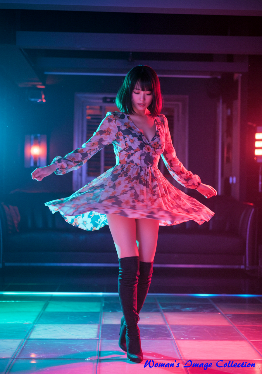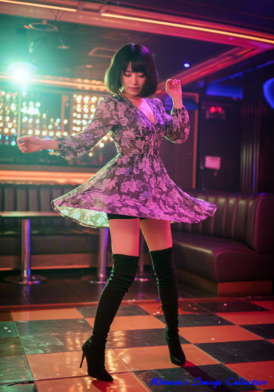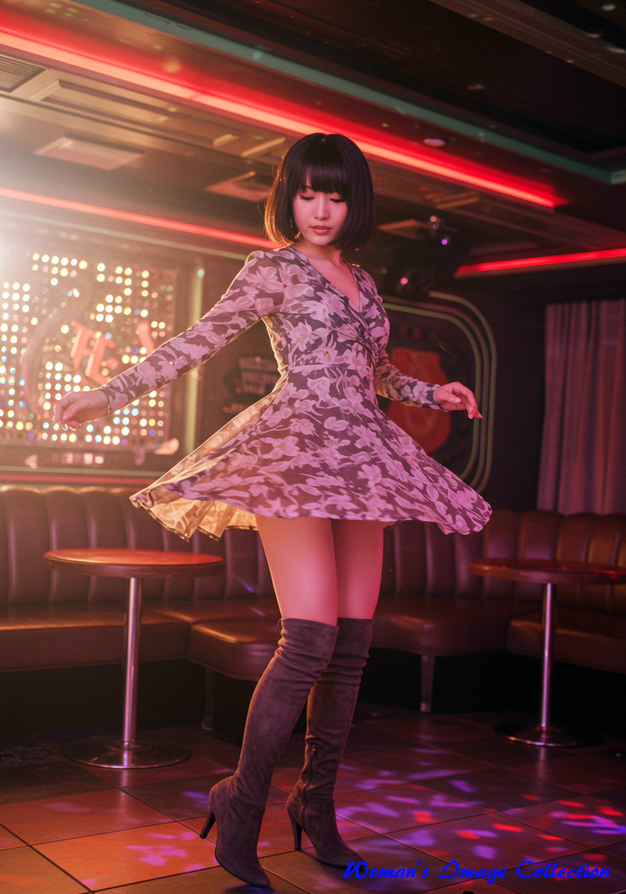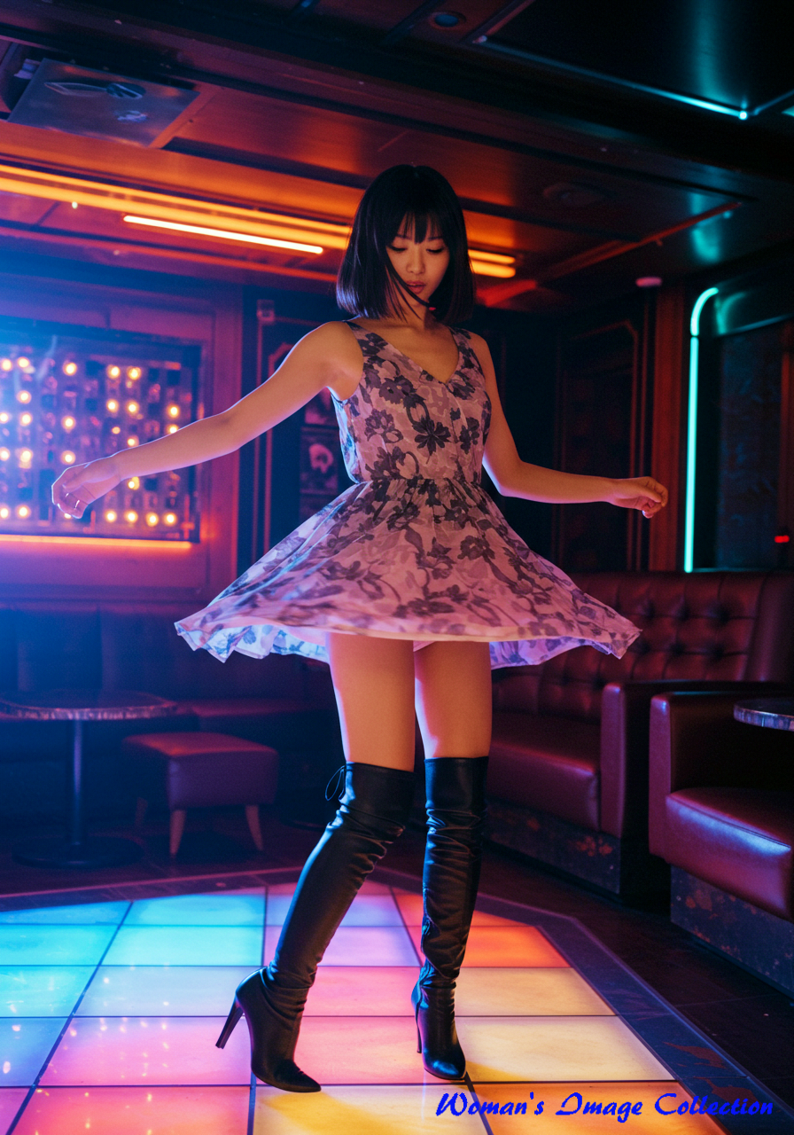 シアーミニドレス の日本の少女が、高転しながら熱心に踊っている。彼女はロングブーツを履き、スタイリッシュなボブカットの髪型をしている。背景:レトロフューチャーな装飾と輝くダンスフロアを備えた未来的なラウンジ。