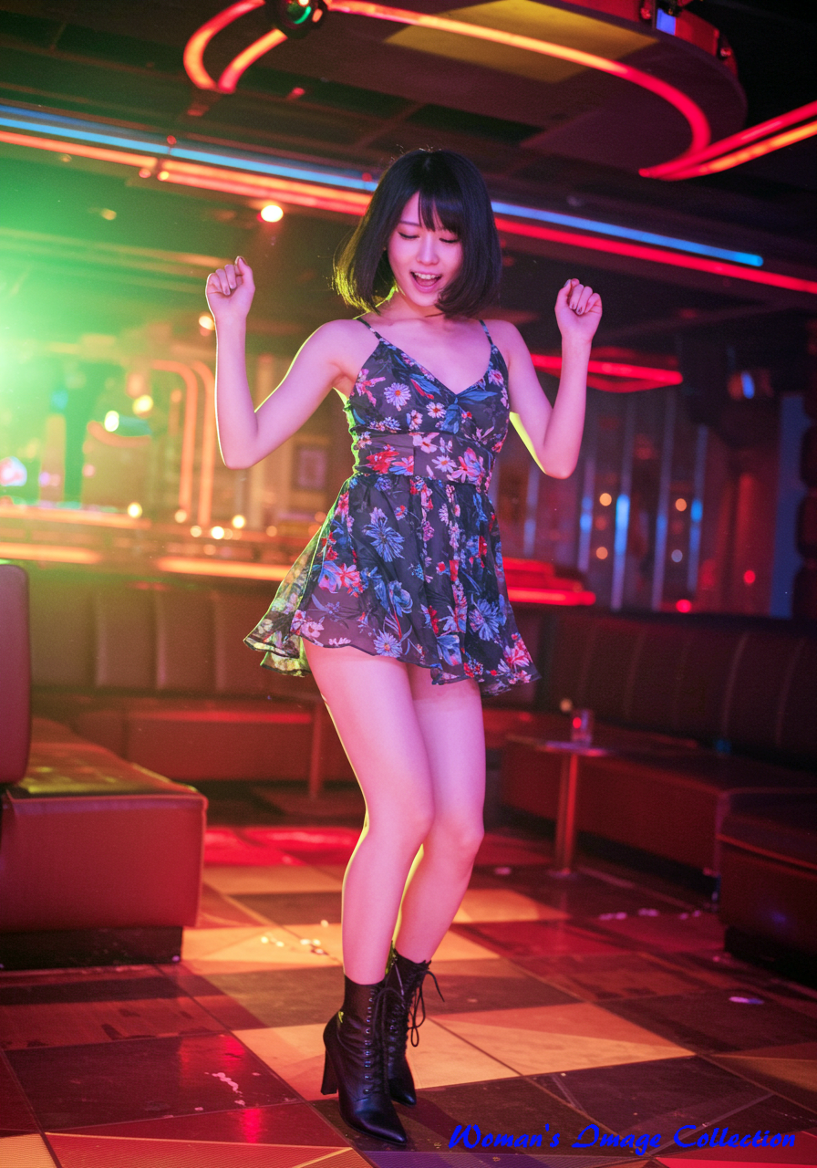彼女の髪は、艶やかな黒髪で、顎のラインで切り揃えられたボブスタイルが、彼女の顔立ちをすっきりと見せている。その髪が、夜の光を浴びて温かく輝くたび、私は遠い夏の日の、穏やかな風の記憶を思い出す。彼女が纏う花柄のミニドレスは、風に優しく舞い、まるで彼女自身が、夜の舞台に咲く、一輪の赤い花のようだ。その清潔感が、この写真の持つ清らかな雰囲気を一層引き立てている。