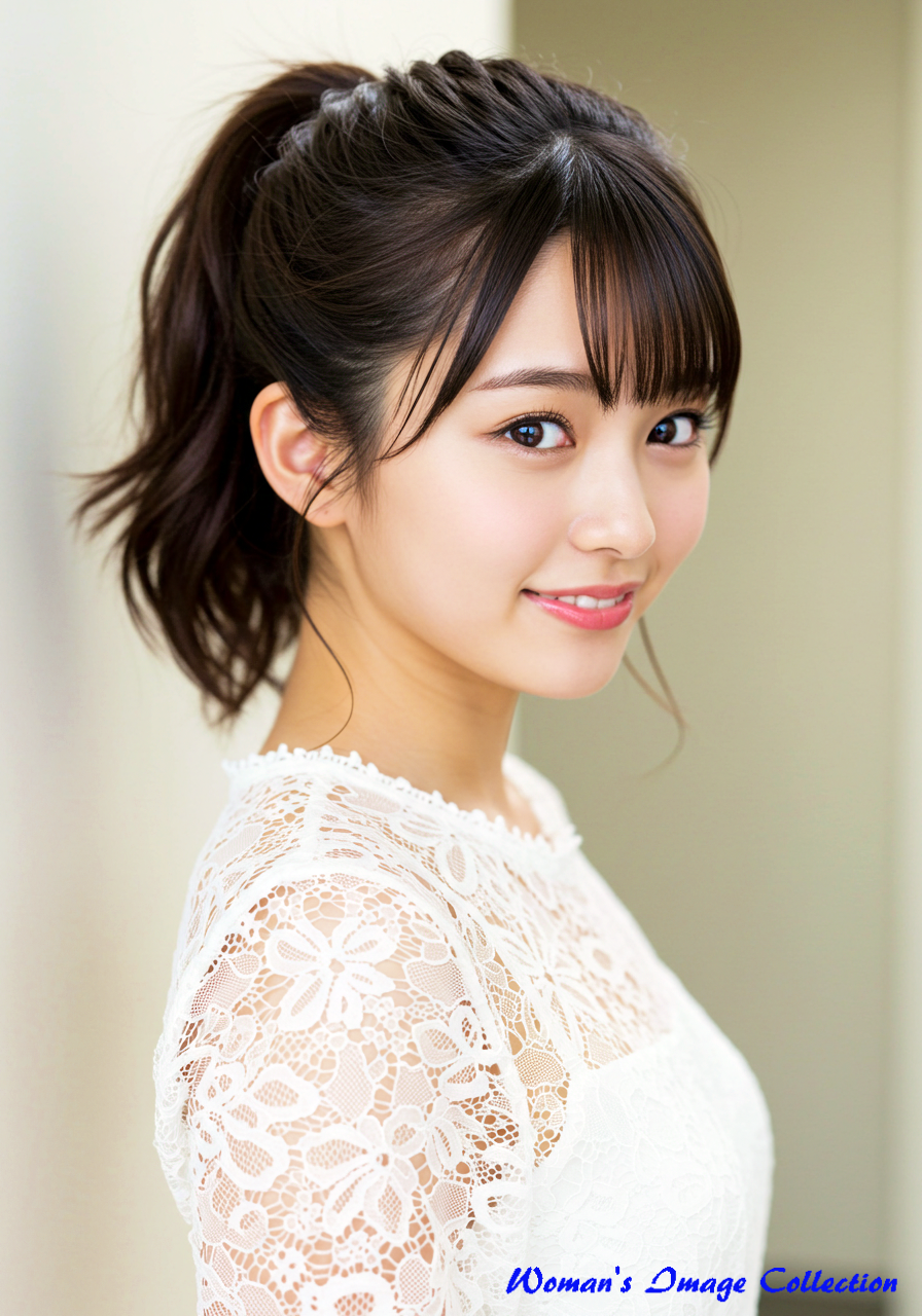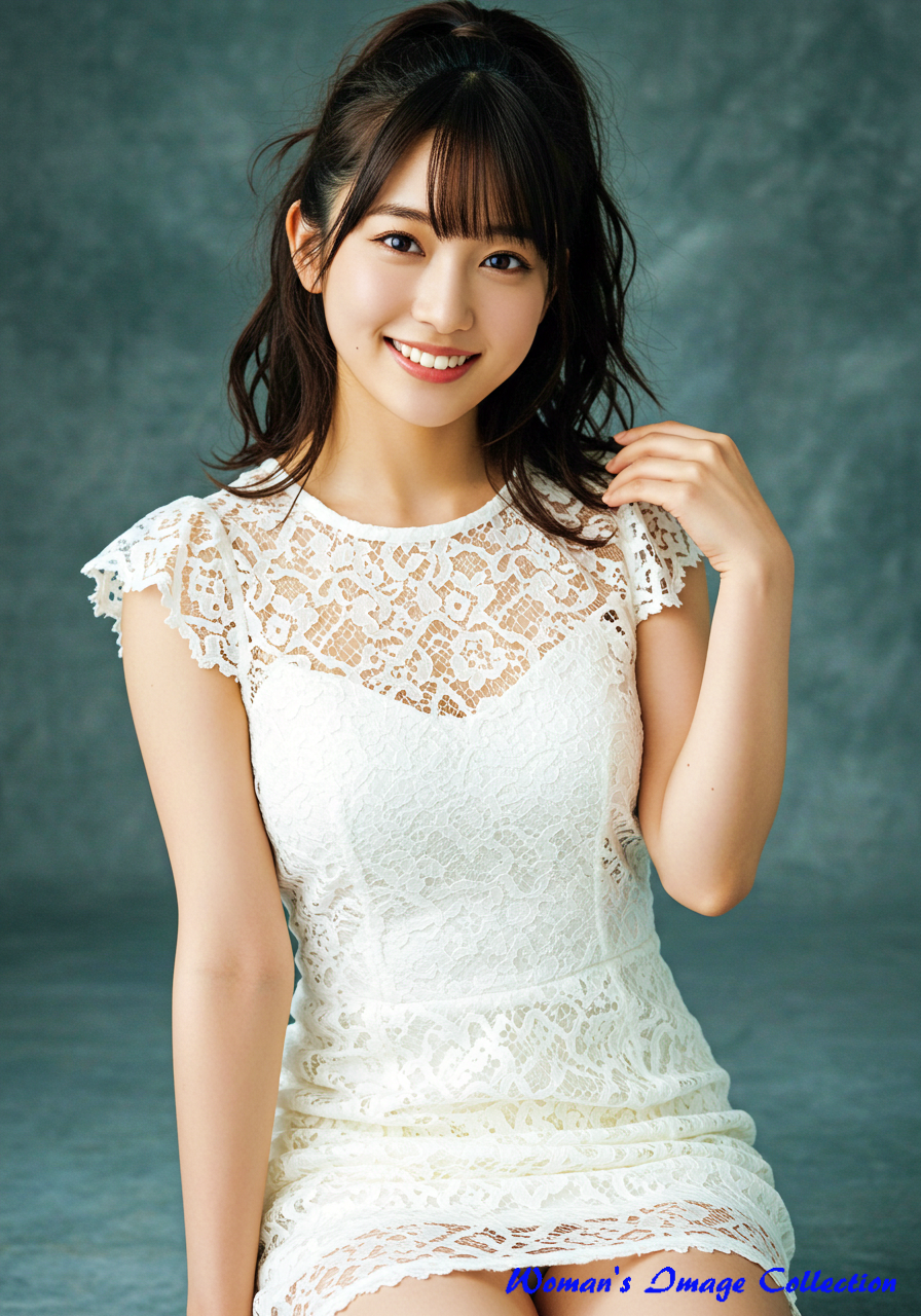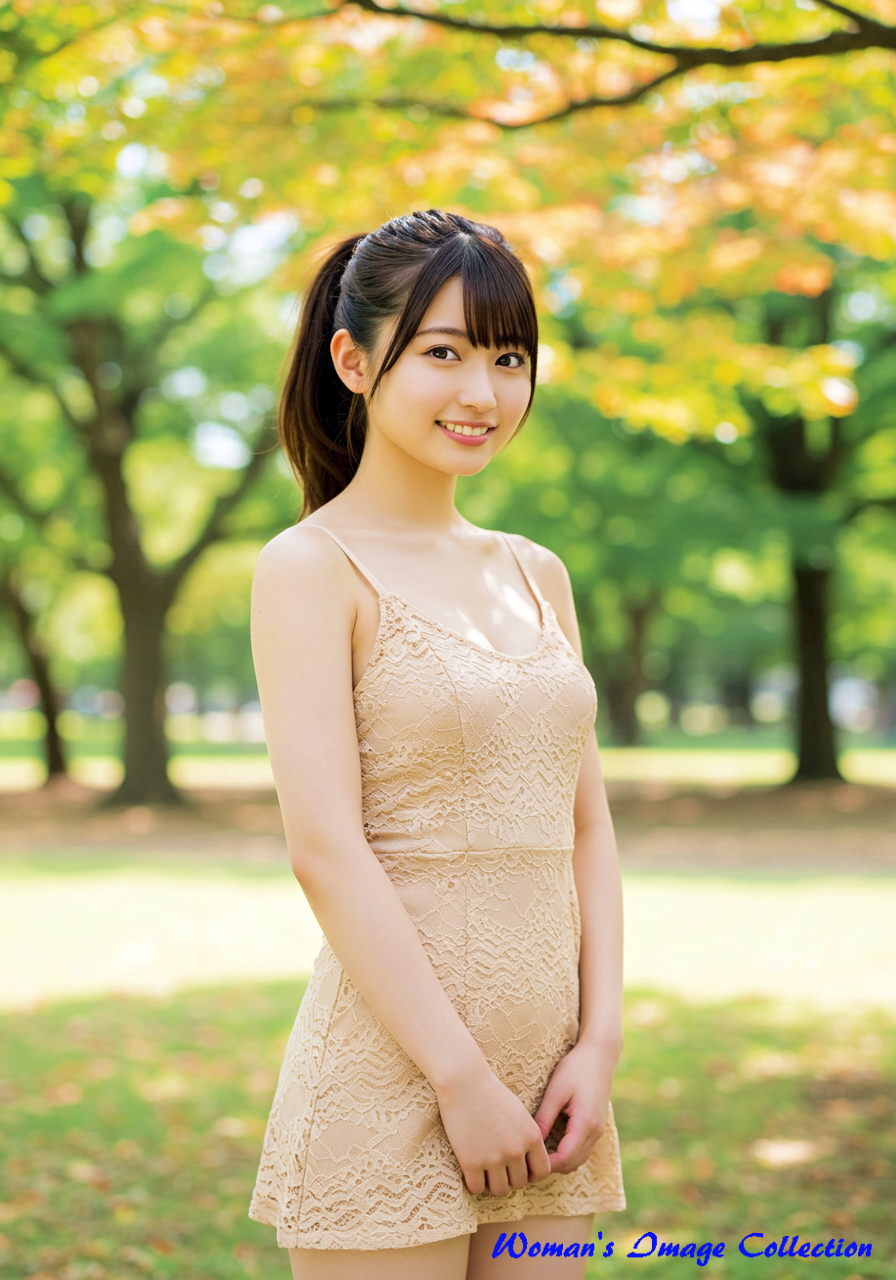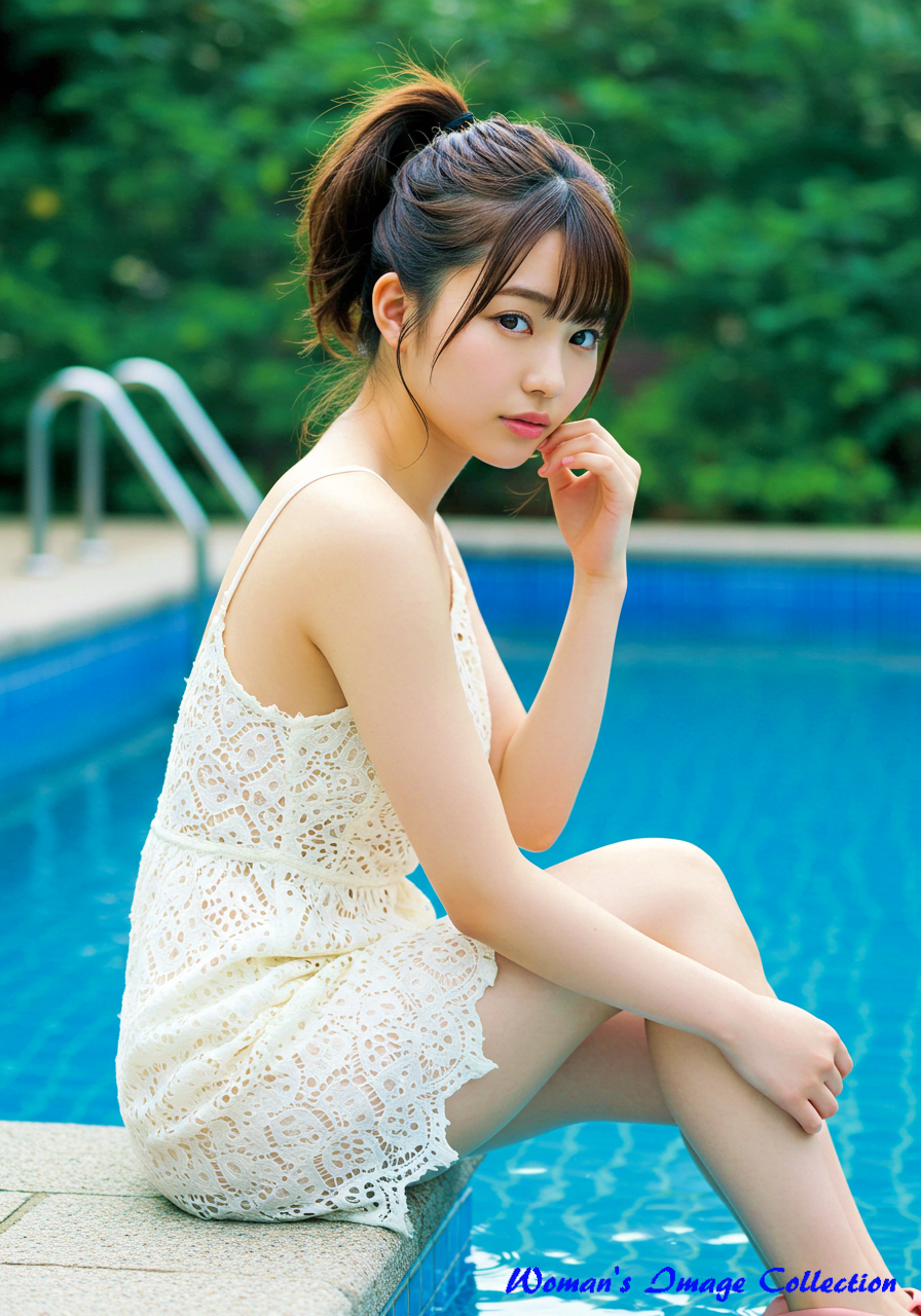 彼女の髪は、艶やかな黒髪で、可愛らしくポニーテールにまとめられている。その髪が、夏の光を浴びて温かく輝くたび、私は遠い夏の日の、穏やかな風の記憶を思い出す。彼女が纏う白いレースのミニドレスは、繊細な模様が施されており、まるで天使の羽衣のようだ。その清潔感が、この写真の持つ清らかな雰囲気を一層引き立てている。