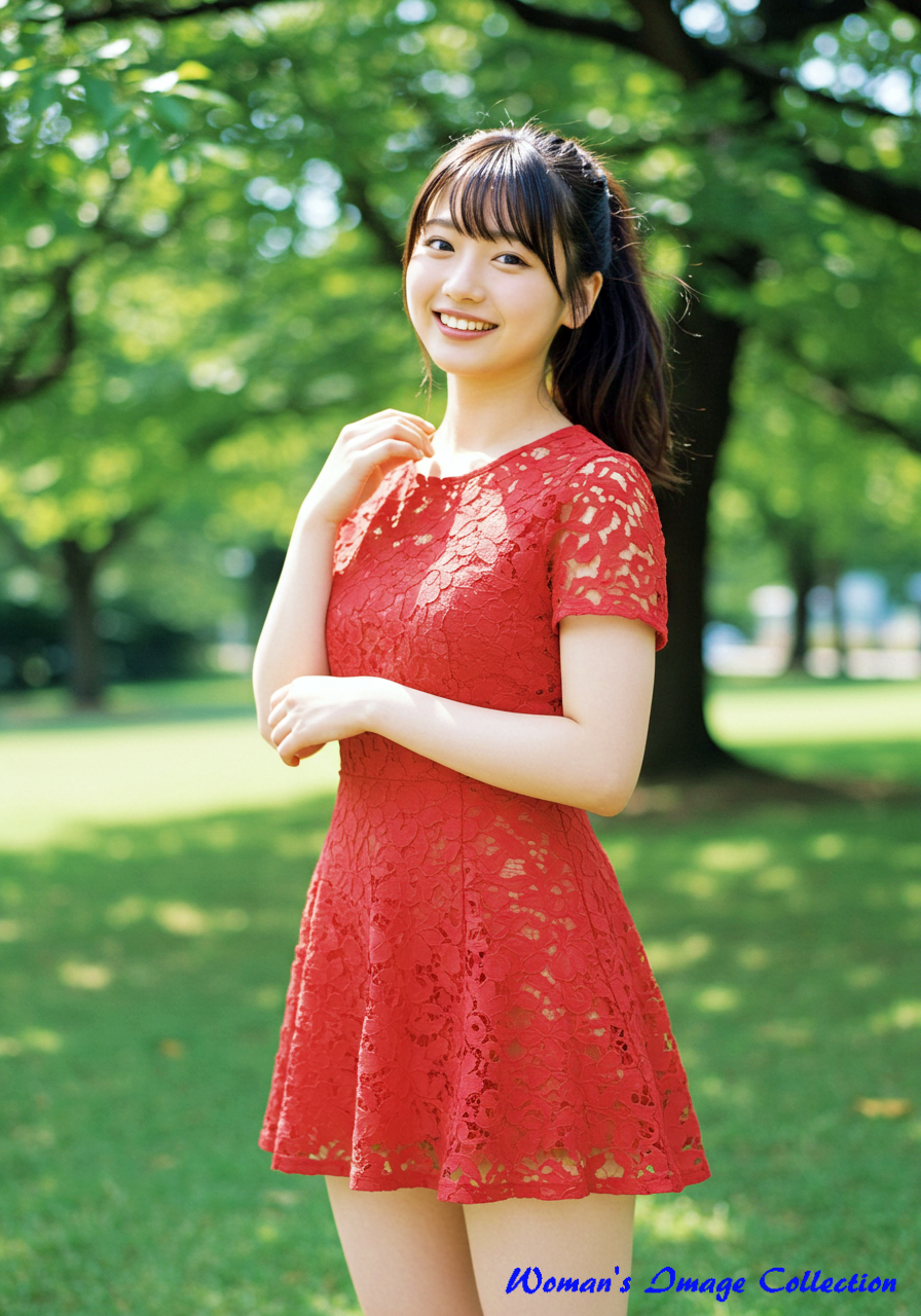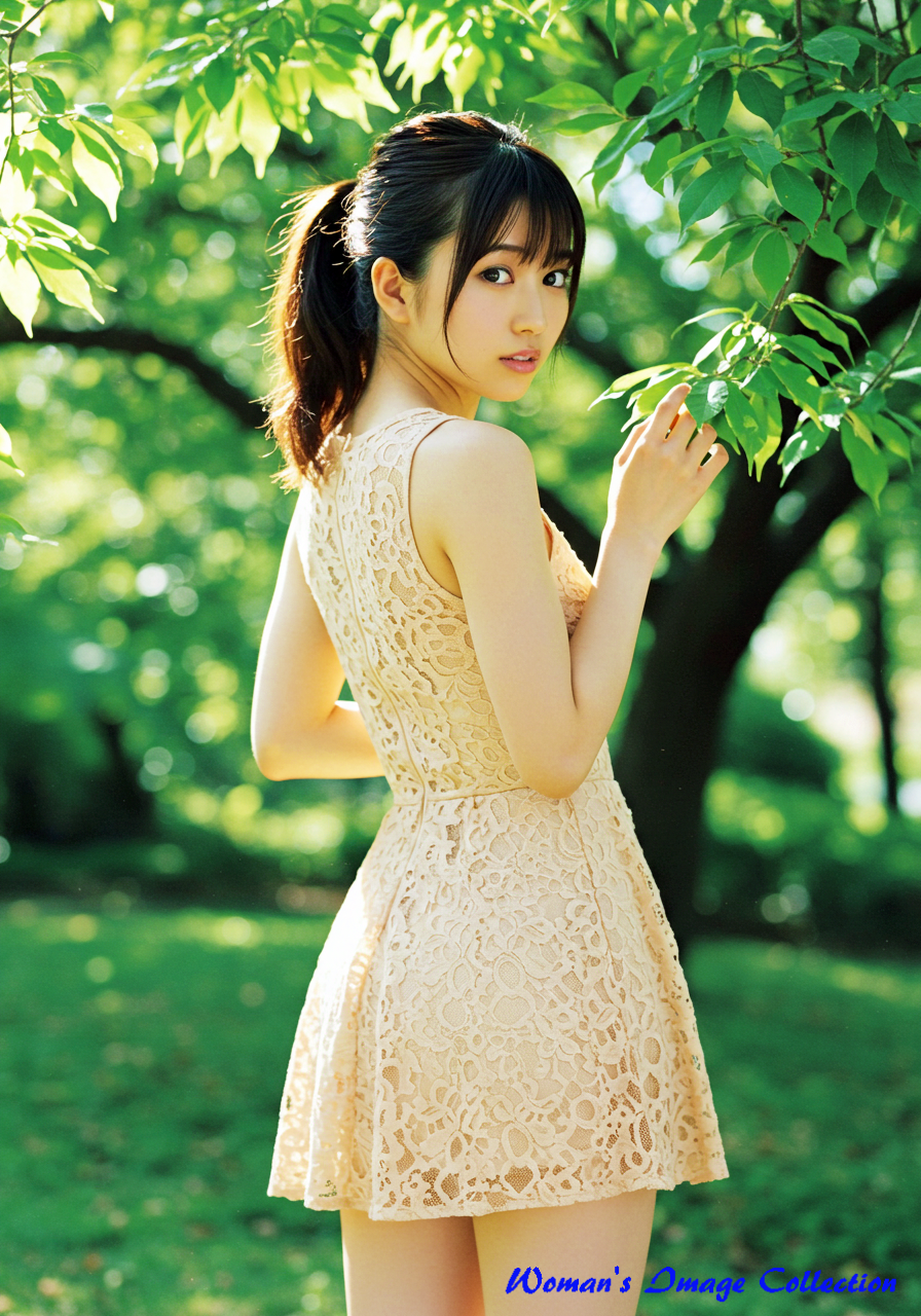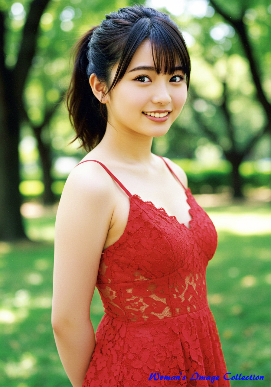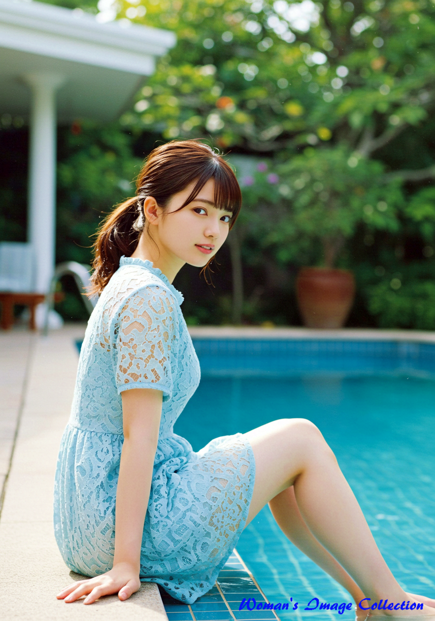 彼女の髪は、艶やかな黒髪で、可愛らしくポニーテールにまとめられている。その髪が、夏の光を浴びて温かく輝くたび、私は遠い夏の日の、穏やかな風の記憶を思い出す。彼女が纏う白いレースのミニドレスは、繊細な模様が施されており、まるで天使の羽衣のようだ。その清潔感が、この写真の持つ清らかな雰囲気を一層引き立てている。