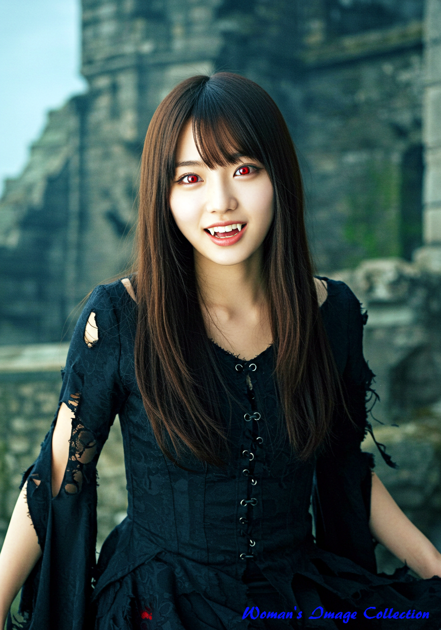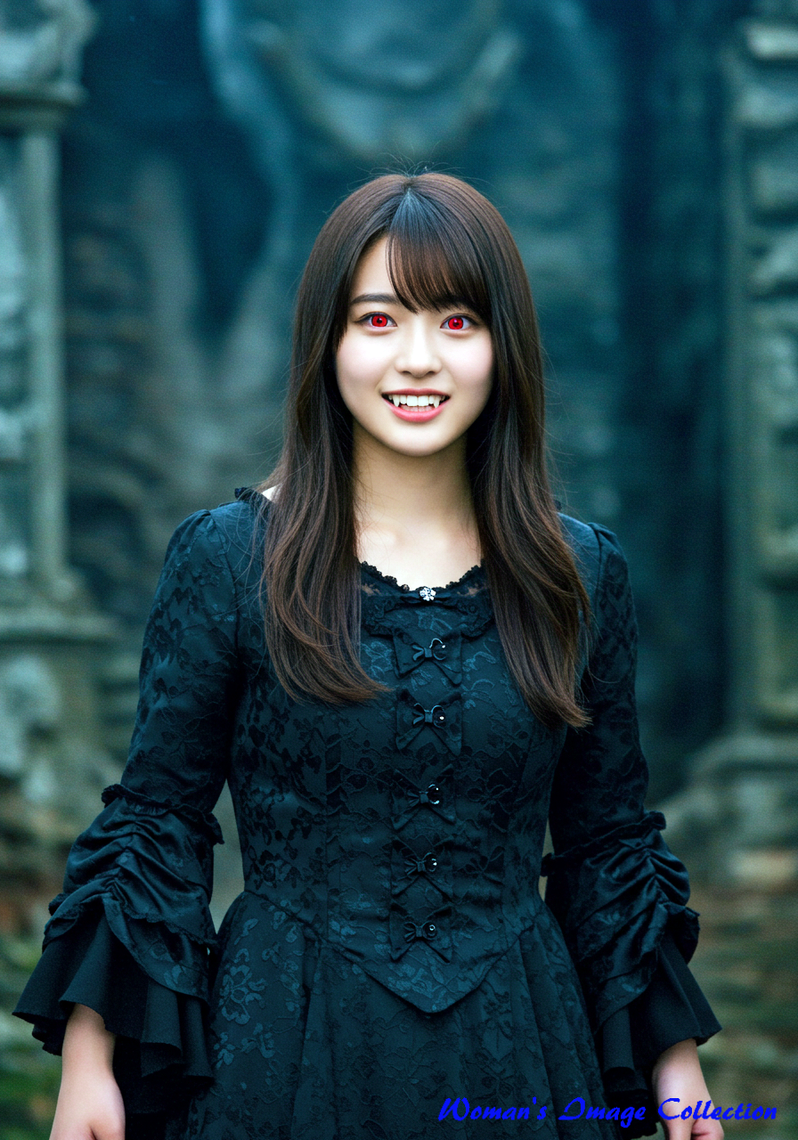 若く笑顔がかわいい日本人の女優。崩れかけた城の影から、赤く光る目と鋭い牙を持つ不気味な女性吸血鬼が姿を現す。彼女は動くたびに、破れた長いドレスが翻り、捕食者のような威圧感を漂わせている。