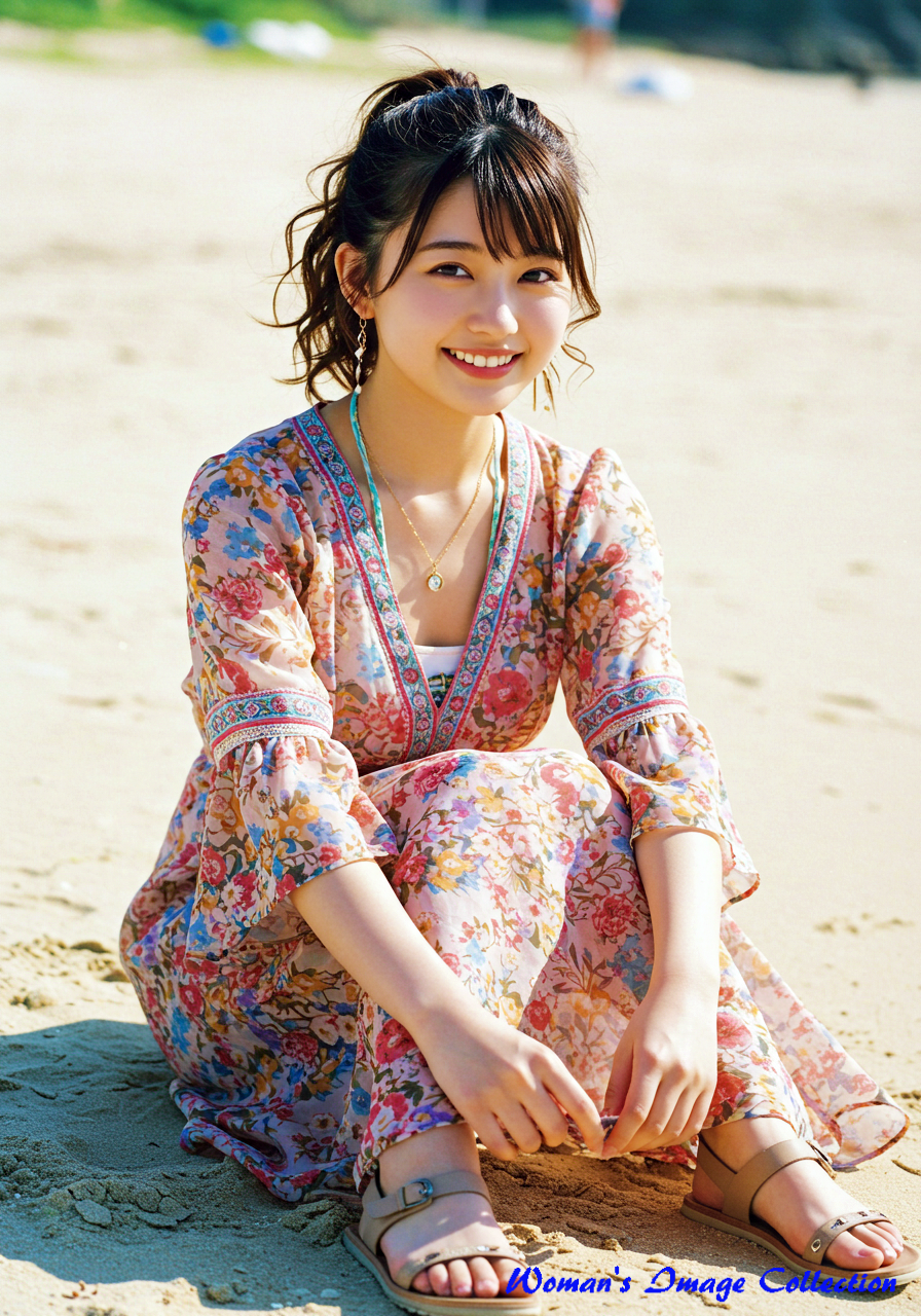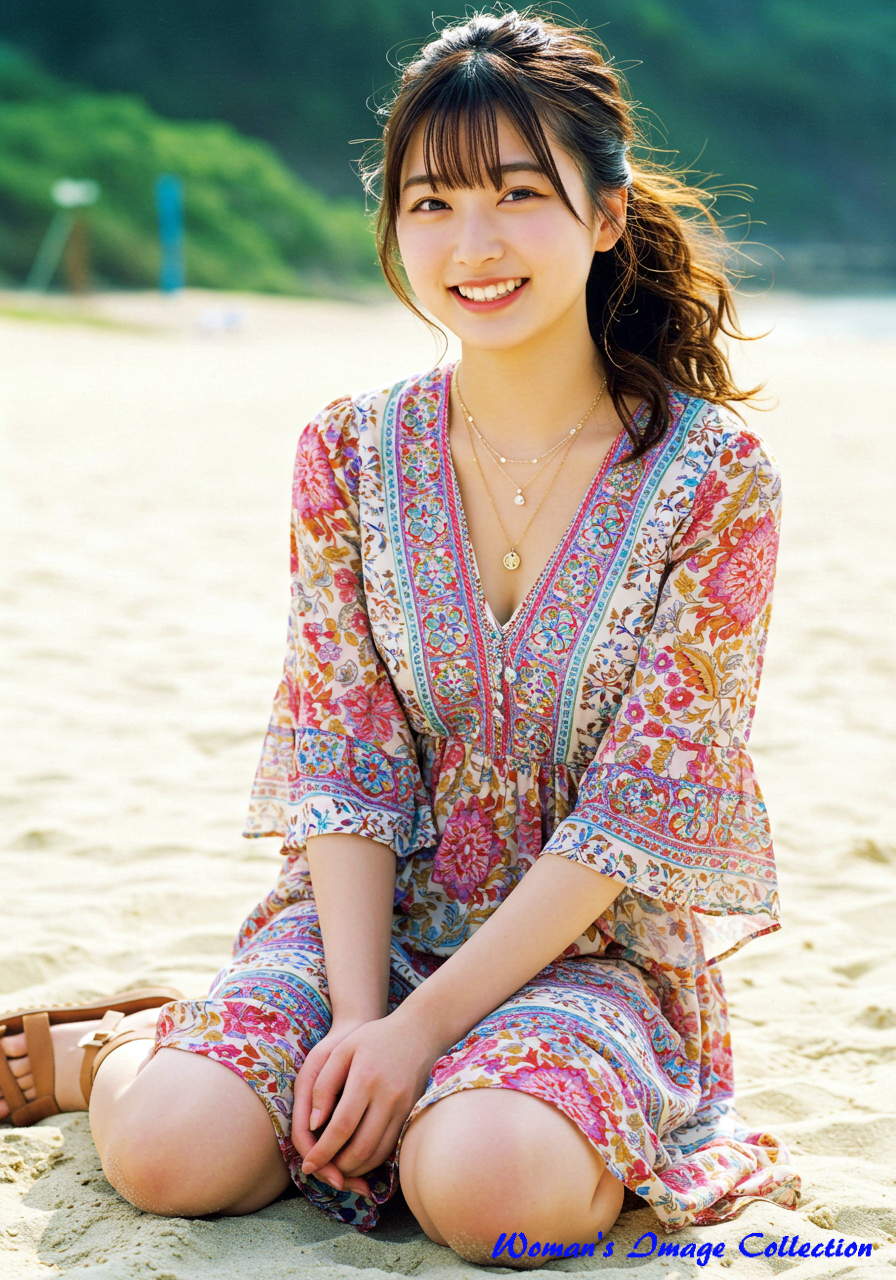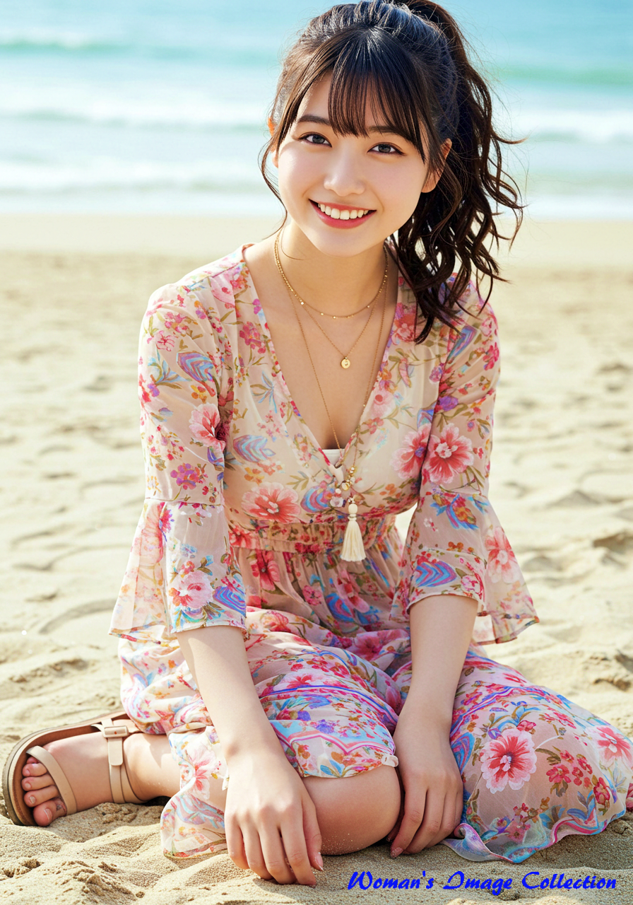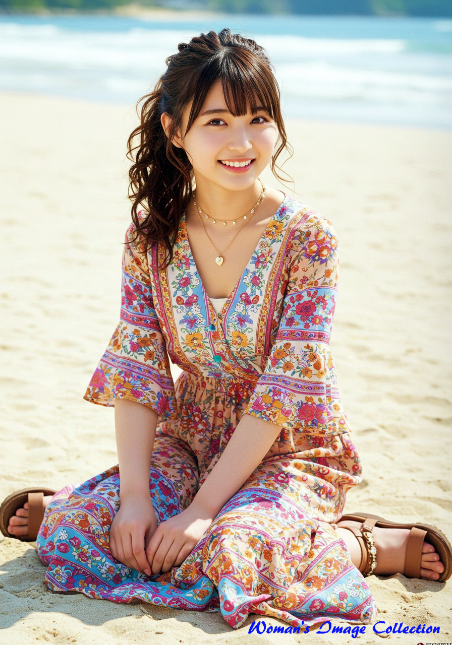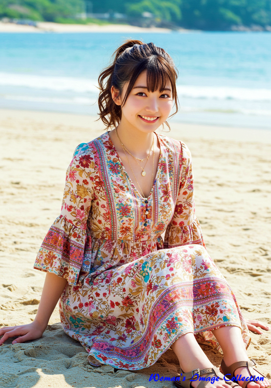 若く丸い顔の笑顔がかわいい日本人の女優 は、ロマンティックでボヘミアン風のデザインが特徴のドレスを着用しています。ドレスは深いVネックとフレア袖が特徴で、鮮やかな花柄のパターンと流れるようなスカートが特徴です。アクセサリーにはレイヤードネックレス、サンダルを合わせています。髪は緩やかな自然なカールでポニテールにしてスタイリングされています。背景は、白い砂浜と澄み切った青い海が広がる日差しの強いビーチ。砂浜に座っています。