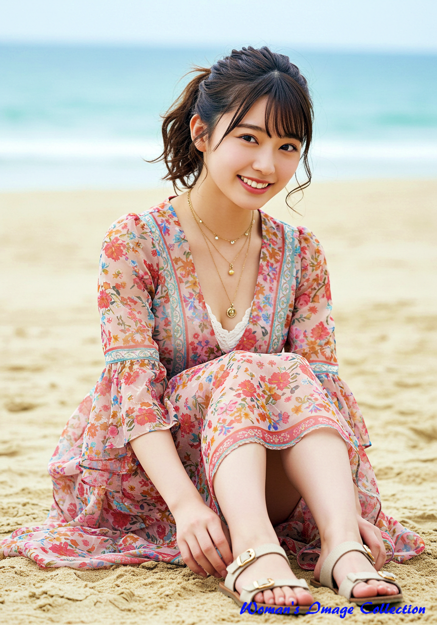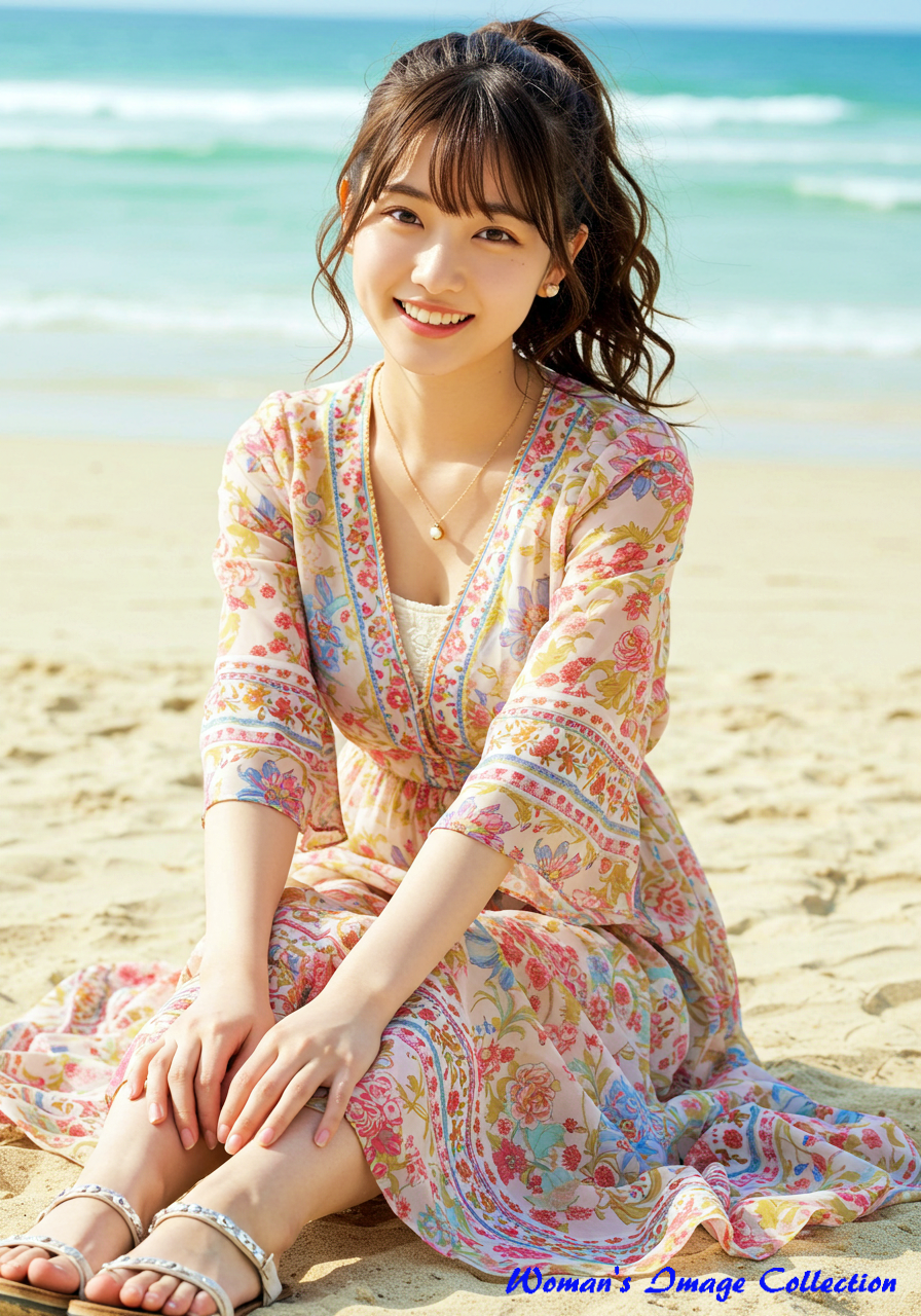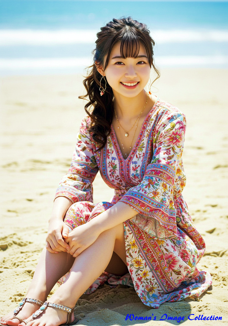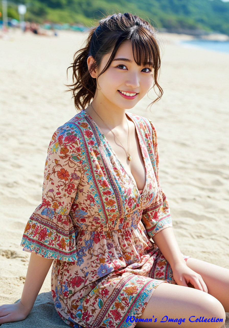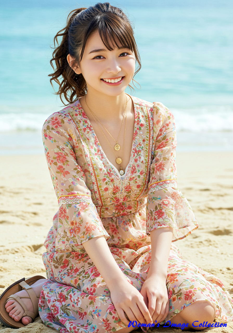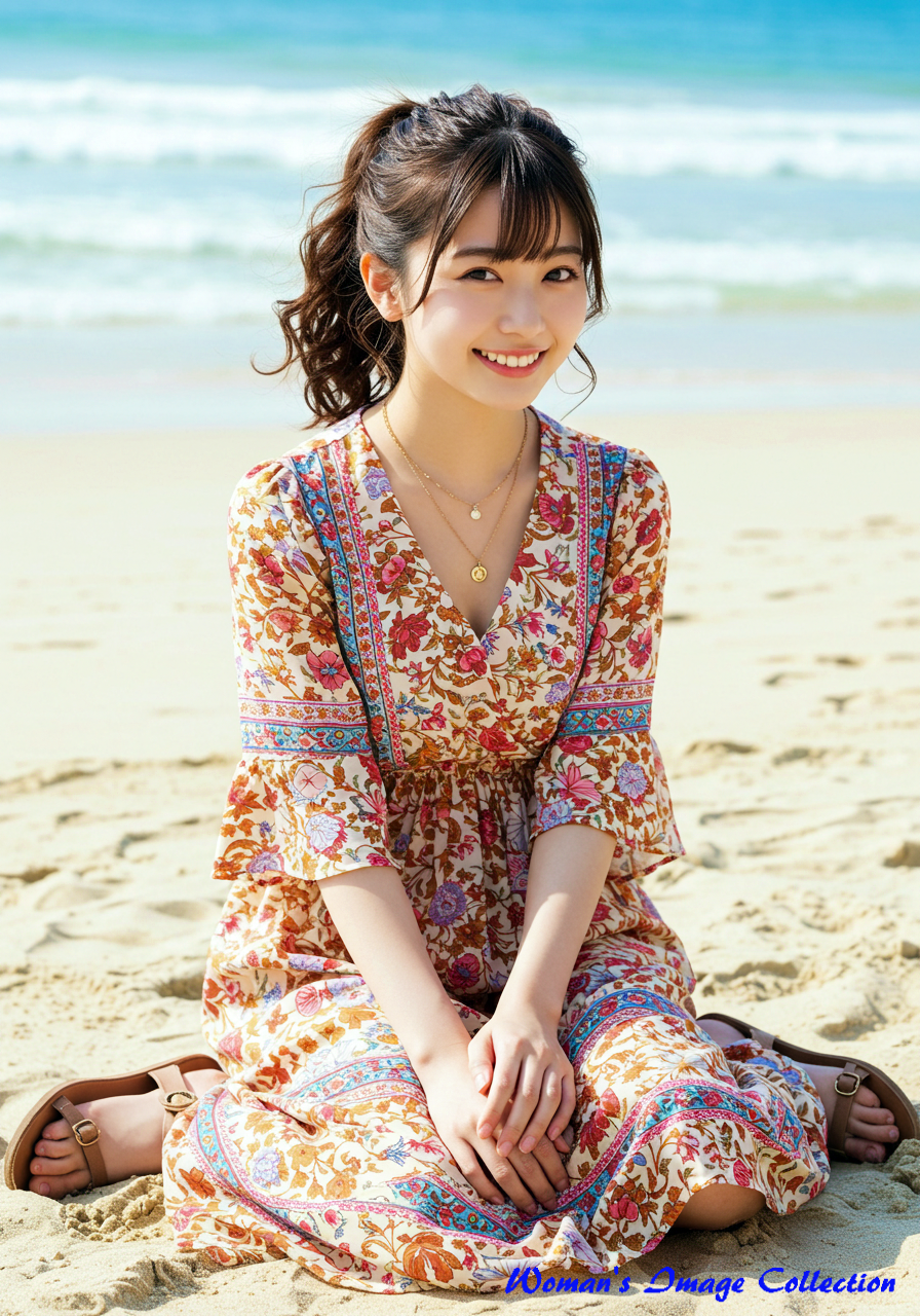若く丸い顔の笑顔がかわいい日本人の女優 は、ロマンティックでボヘミアン風のデザインが特徴のドレスを着用しています。ドレスは深いVネックとフレア袖が特徴で、鮮やかな花柄のパターンと流れるようなスカートが特徴です。アクセサリーにはレイヤードネックレス、サンダルを合わせています。髪は緩やかな自然なカールでポニテールにしてスタイリングされています。背景は、白い砂浜と澄み切った青い海が広がる日差しの強いビーチ。砂浜に座っています。