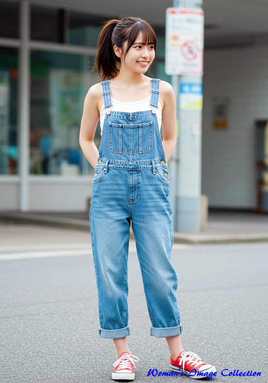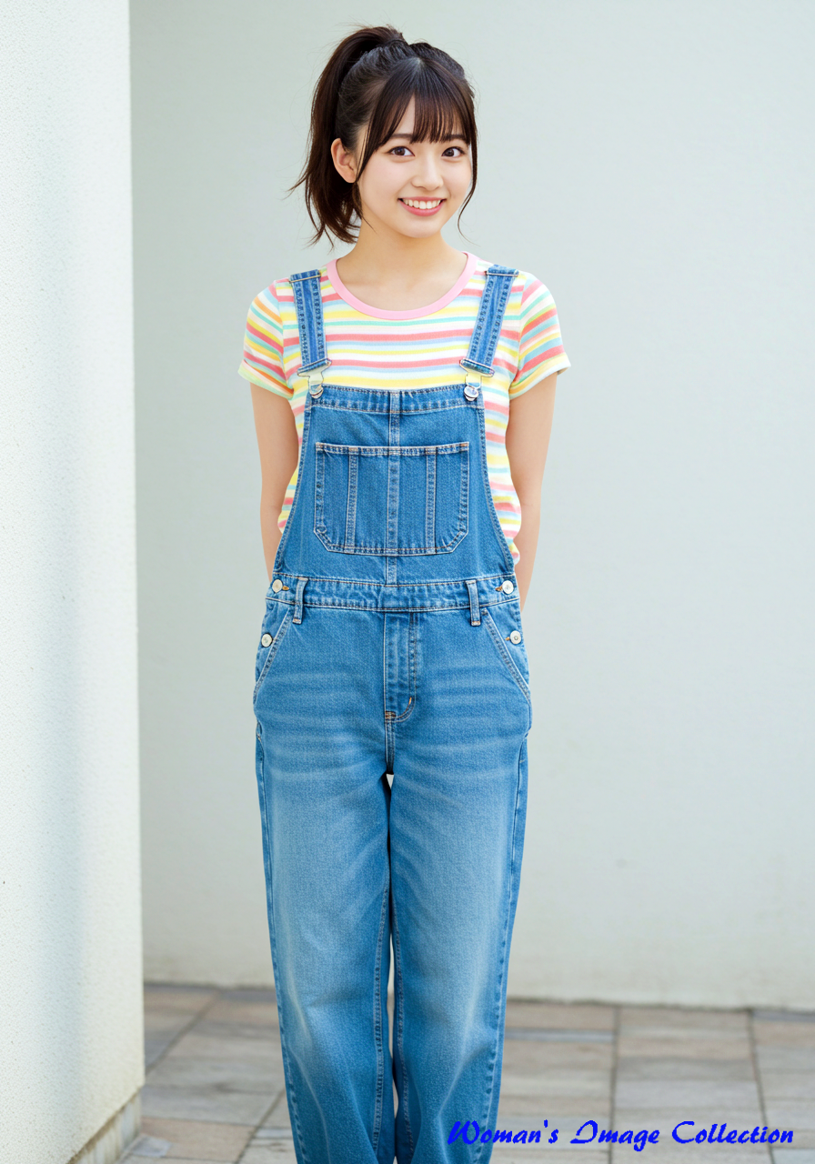This full-length portrait of a cute Japanese actress in her twenties with a ponytail features a round face and an attractive, natural smile. She is wearing overalls that would be perfect for the cover of a fashion magazine.