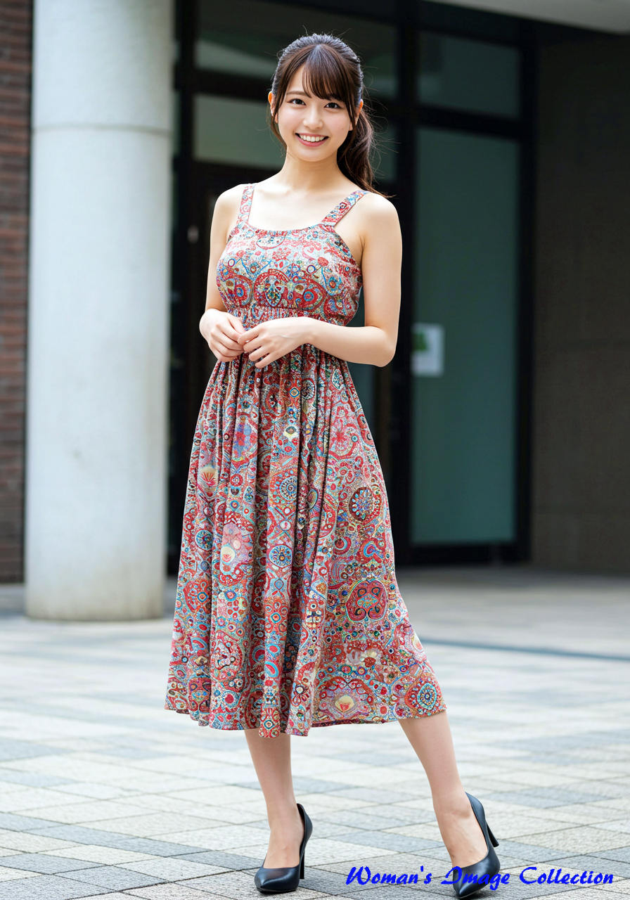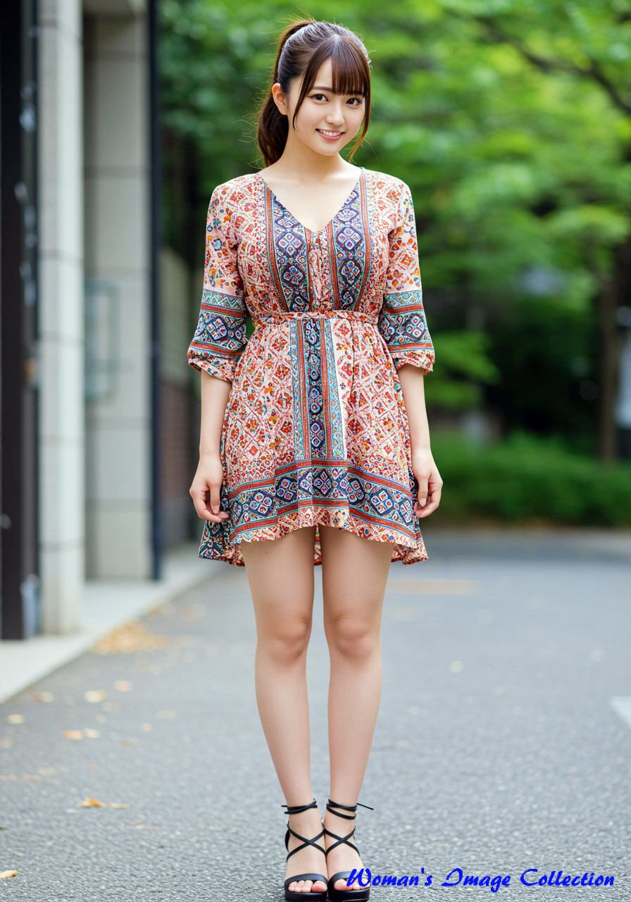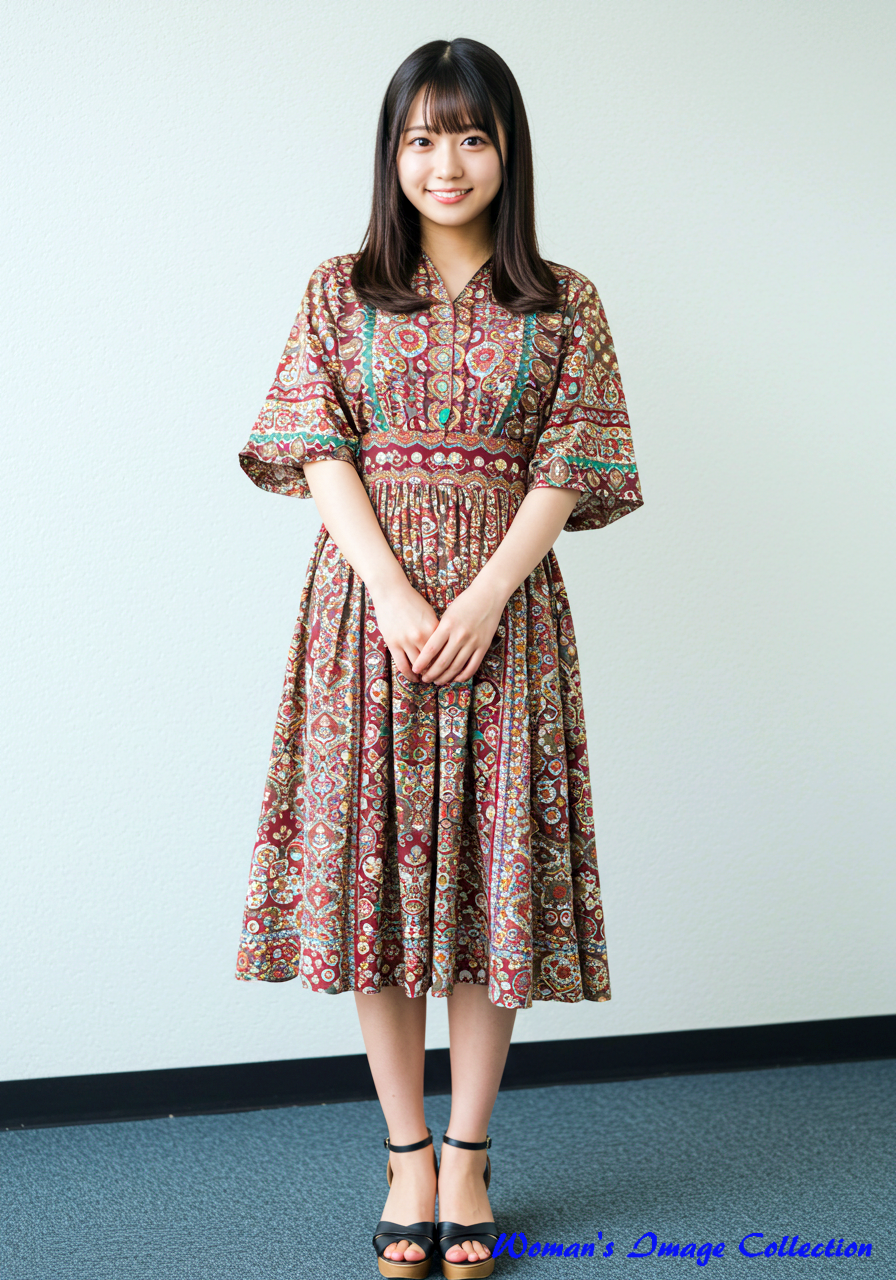 the great long large breast. This full-length portrait of a cute Japanese actress in her twenties with a ponytail features a round face and an attractive, natural smile. She is wearing Ethnic style that would be perfect for the cover of a fashion magazine. shoes.