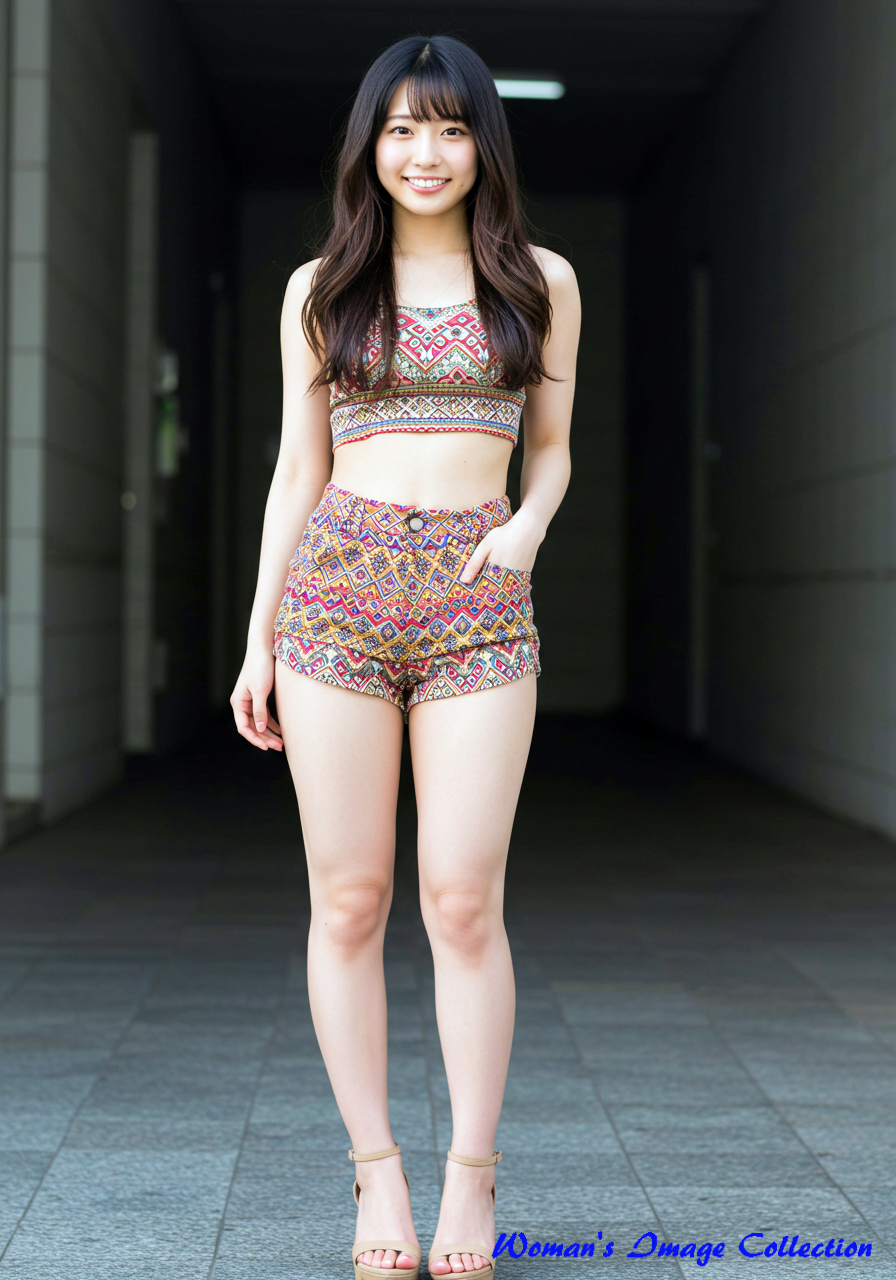 the great long large breast. This full-length portrait of a cute Japanese actress in her twenties with a Shaggy hairstyle features a round face and an attractive, natural smile. She is wearing cropped top and Ethnic-shorts that would be perfect for the cover of a fashion magazine. shoes.