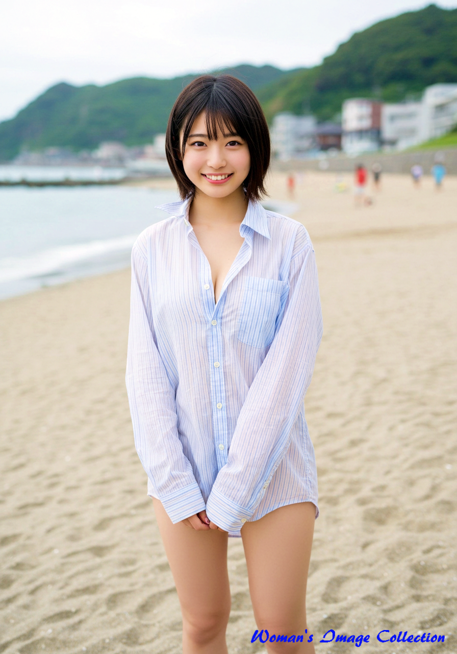 ラフなカッターシャツを着てボタンを留めずに立っているというように設定。場所を海水浴場。長いカッターシャツで最初は設定して画像を生成しましたが、長すぎてイメージに合わなかったので普通のカッターシャツに変更しました。