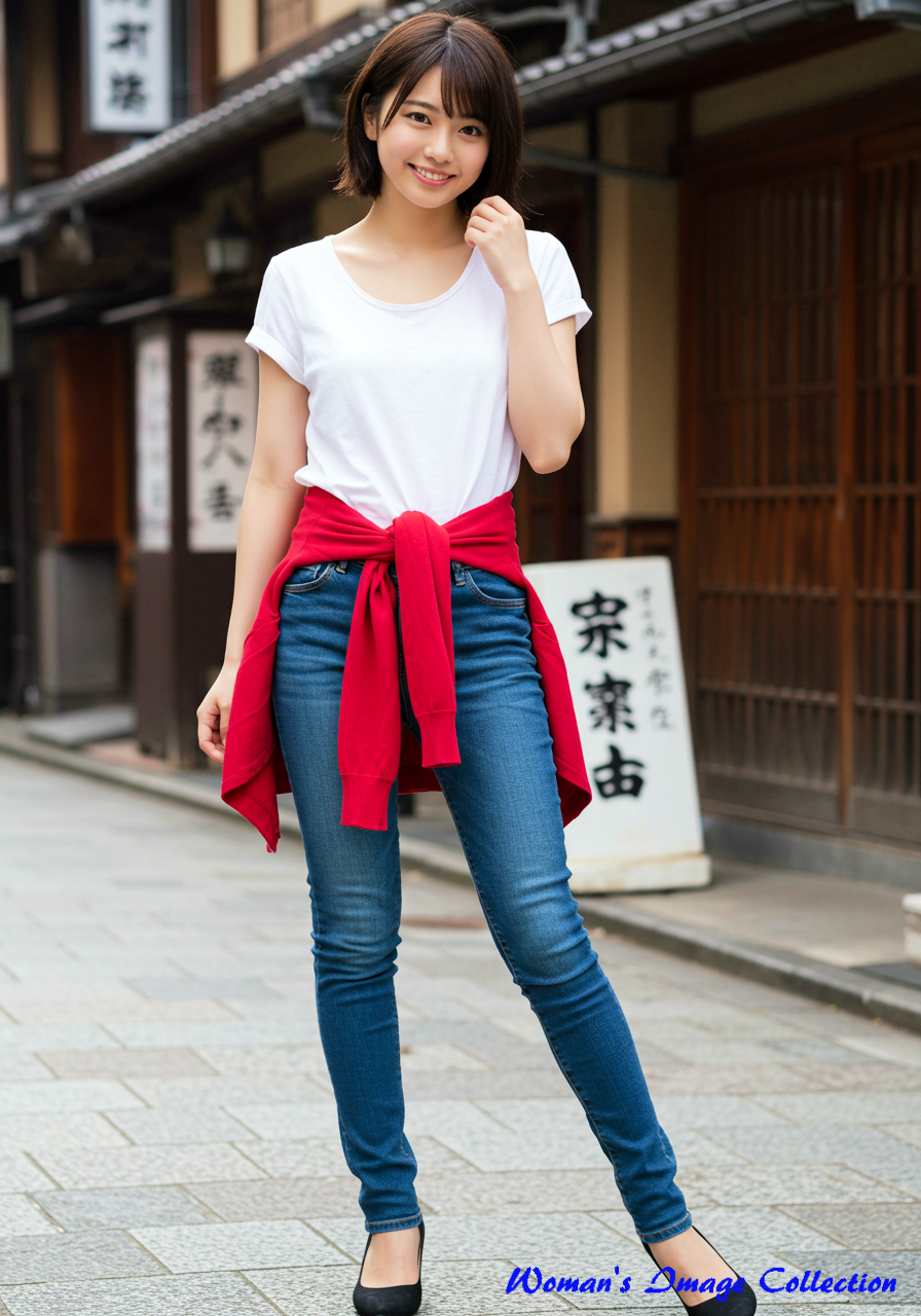 白いTシャツにデニムのパンツを穿き、腰に赤いカーディガンを巻いた女性の設定。場所は京都の街並。2名目は後ろ姿(Her back view.)というプロンプトを追加しました。残念ながら、背景の看板は日本語対応できていないのでおかしな文字になります。背景に日本語が含まれる場合はぼかすほうがいいと思います。