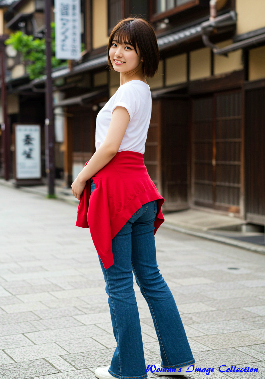 白いTシャツにデニムのパンツを穿き、腰に赤いカーディガンを巻いた女性の設定。場所は京都の街並。2名目は後ろ姿(Her back view.)というプロンプトを追加しました。残念ながら、背景の看板は日本語対応できていないのでおかしな文字になります。背景に日本語が含まれる場合はぼかすほうがいいと思います。