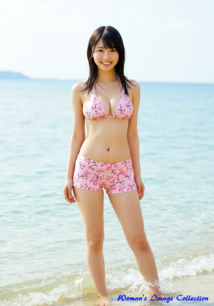 vary tall and very long legs ,skinny woman, the great long large breast. This full-length portrait of a cute Japanese actress in her twenties with a Perms & Waves features a round face and an attractive, natural smile. She is wearing low-rise bikini shorts with a small cherry blossom petal pattern that would be perfect for the cover of a fashion magazine. Cute poses in the sea.